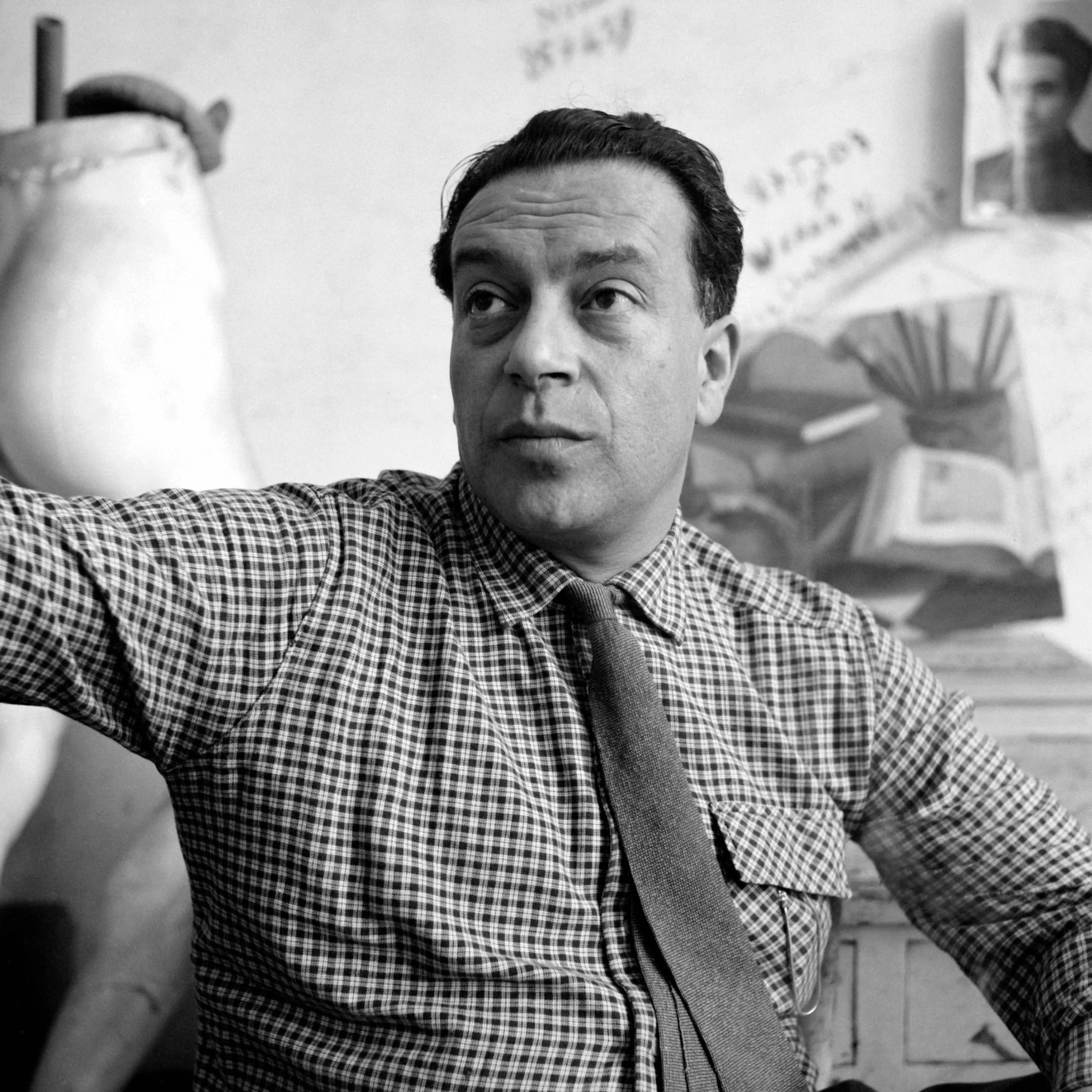 Black and white photograph, man from the waist up in a plaid shirt and loosened tie, arm raised toward a ceramic vessel, facing the camera