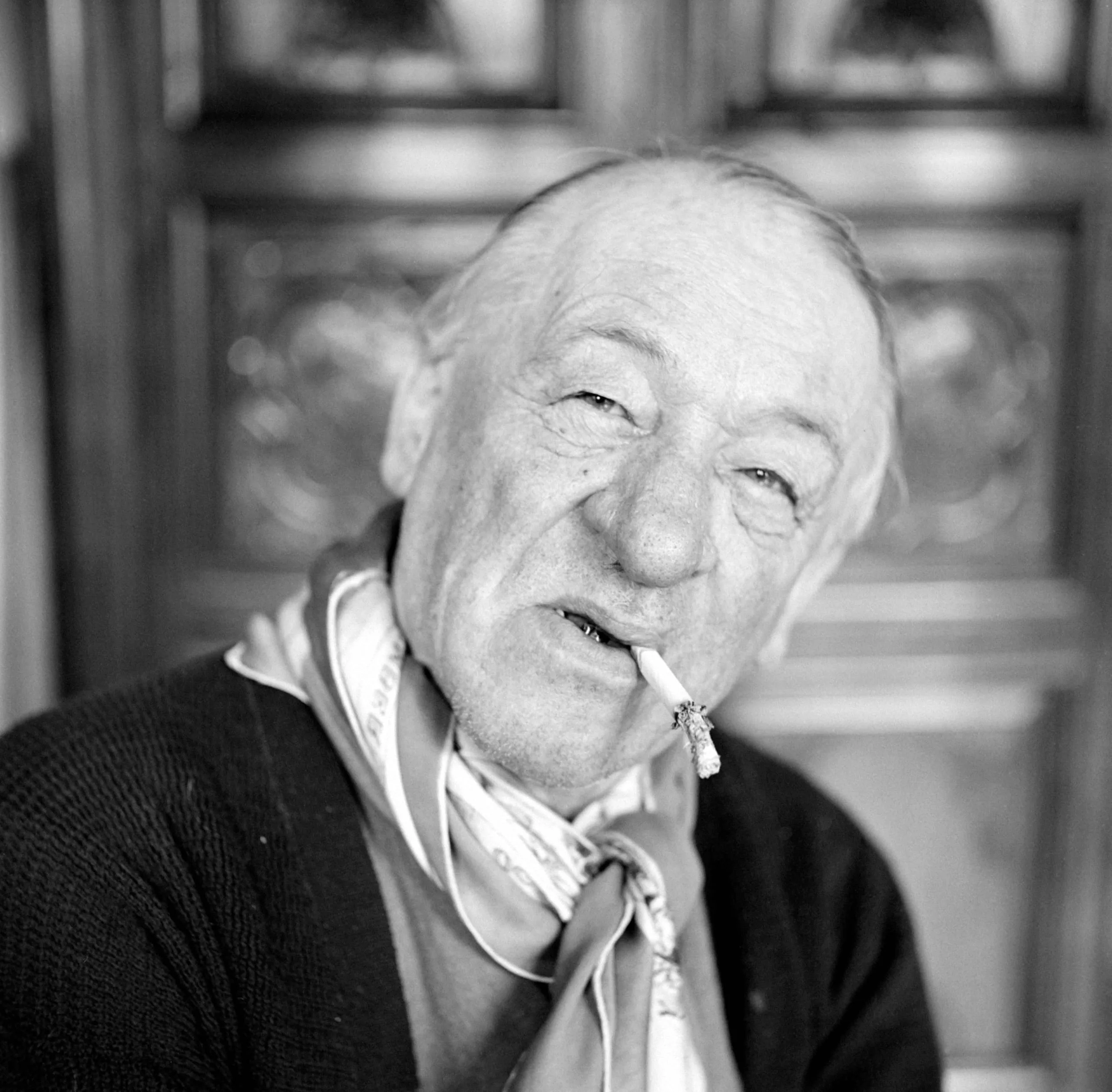 Black and white portrait photograph, elderly man with a lit cigarette between his lips, wearing a dark knit sweater and loosely knotted silk scarf, soft diffused lighting