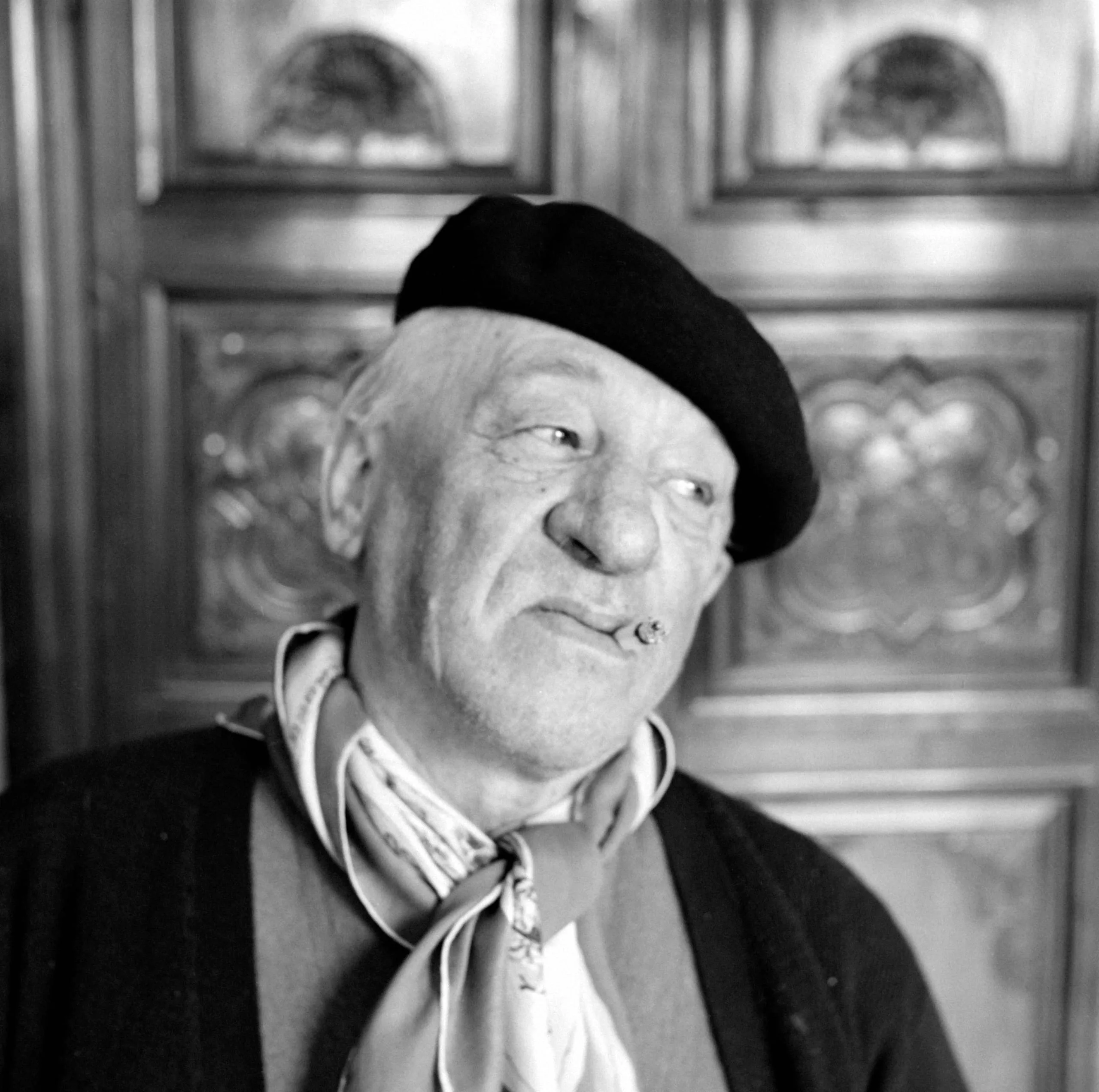 Black and white portrait photograph of an older white man in a black beret with a cigar at his lips, angled slightly upward, against a carved wooden paneled door