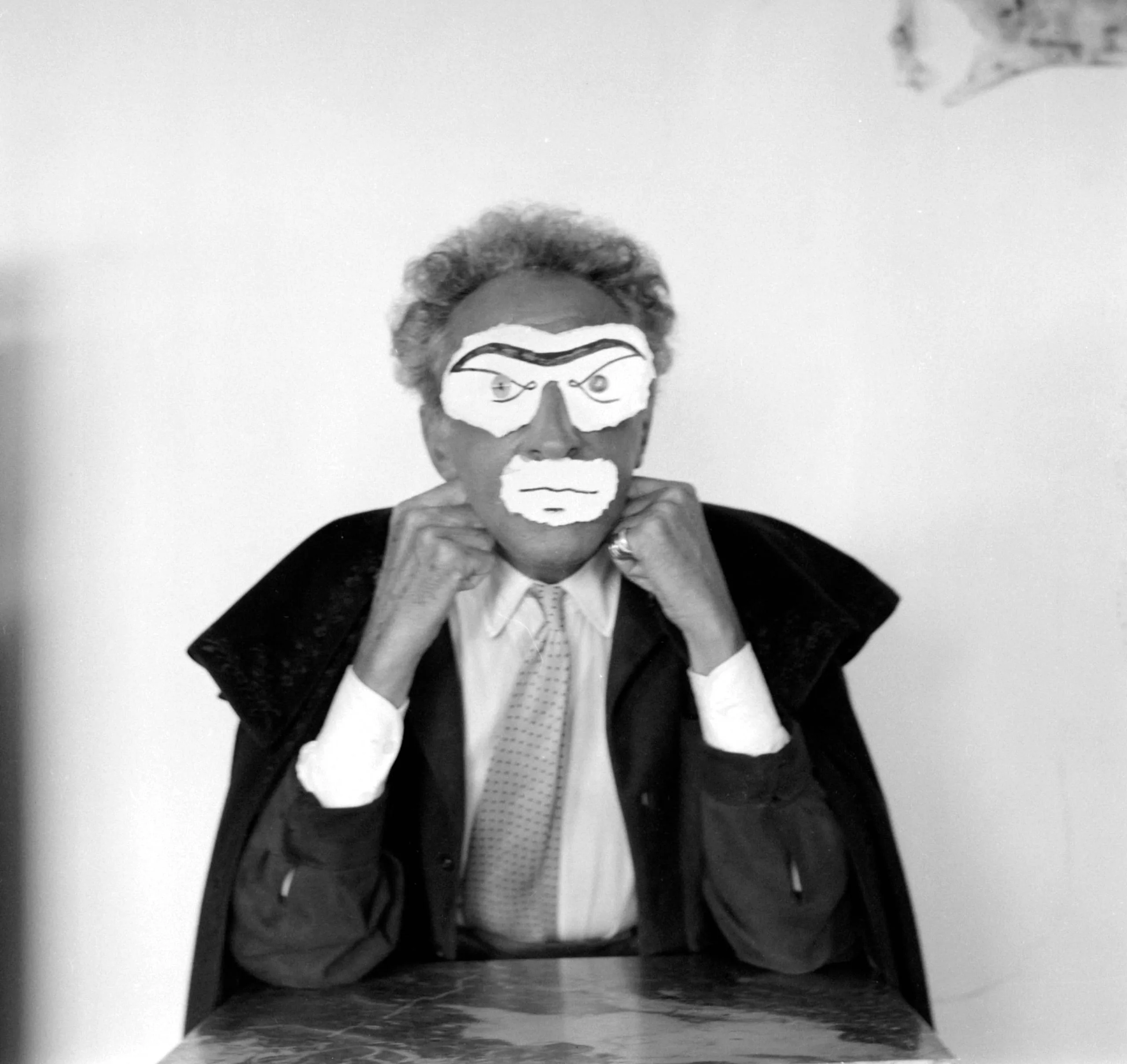 Black and white photograph of a man in a suit holding a hand-painted mask to his face, seated at a table against a plain wall