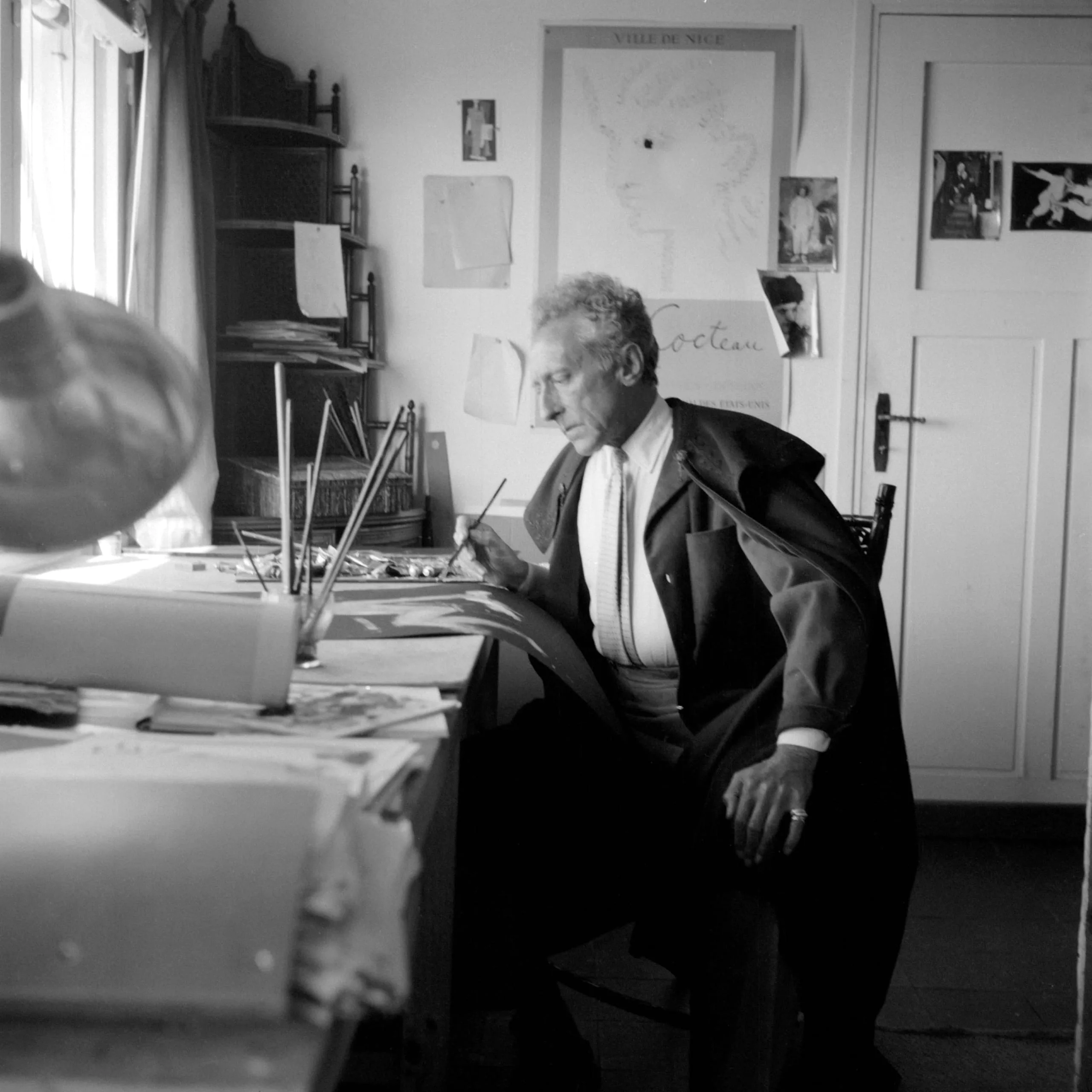 Black and white photograph of an elderly man in a dark academic robe seated at a cluttered studio desk, holding a pencil and small paper, viewed in profile