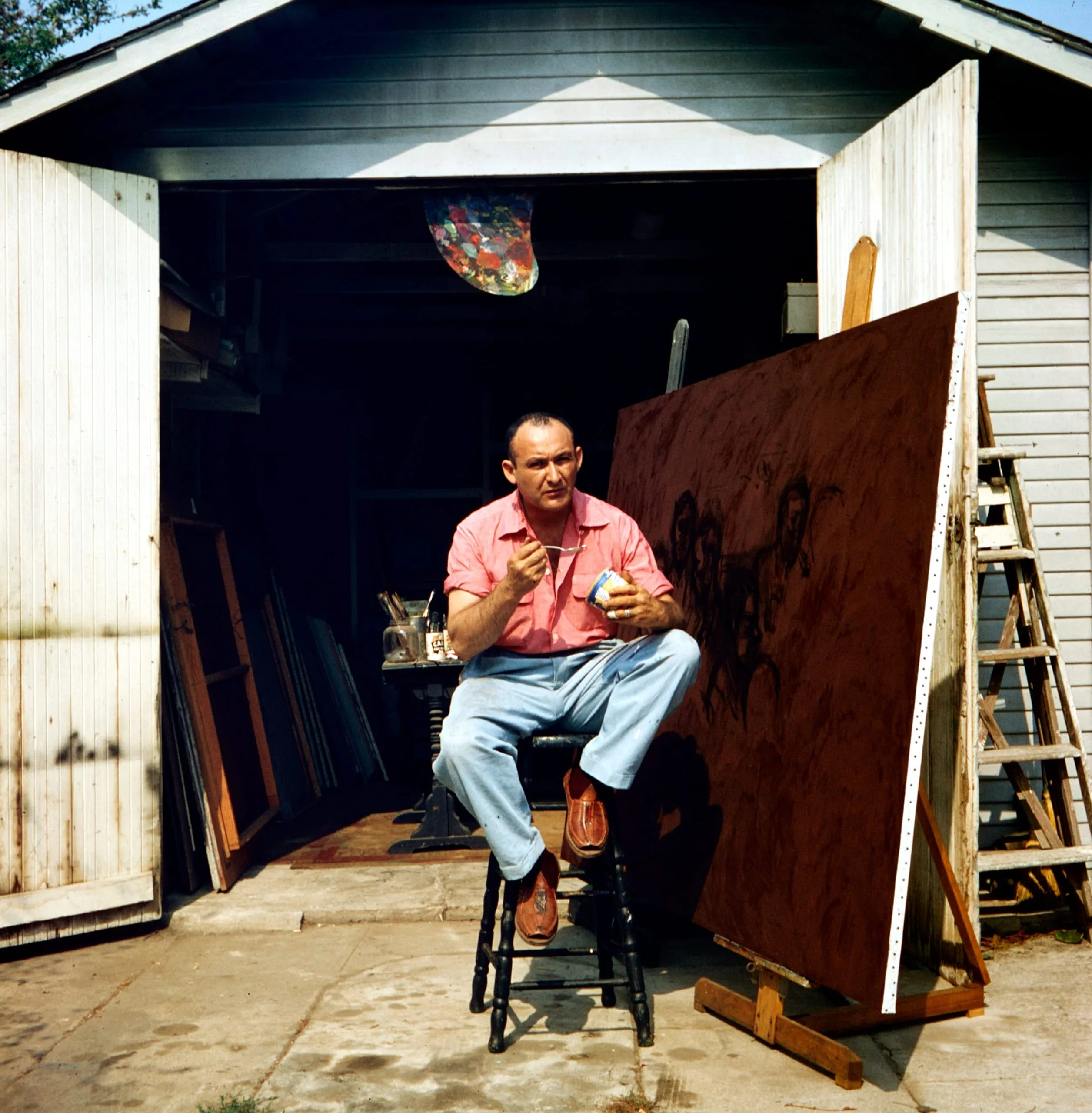 Color photograph of a man in a pink shirt and light blue trousers seated on a stool outside a garage studio, with a large rust-primed canvas on an easel to his right