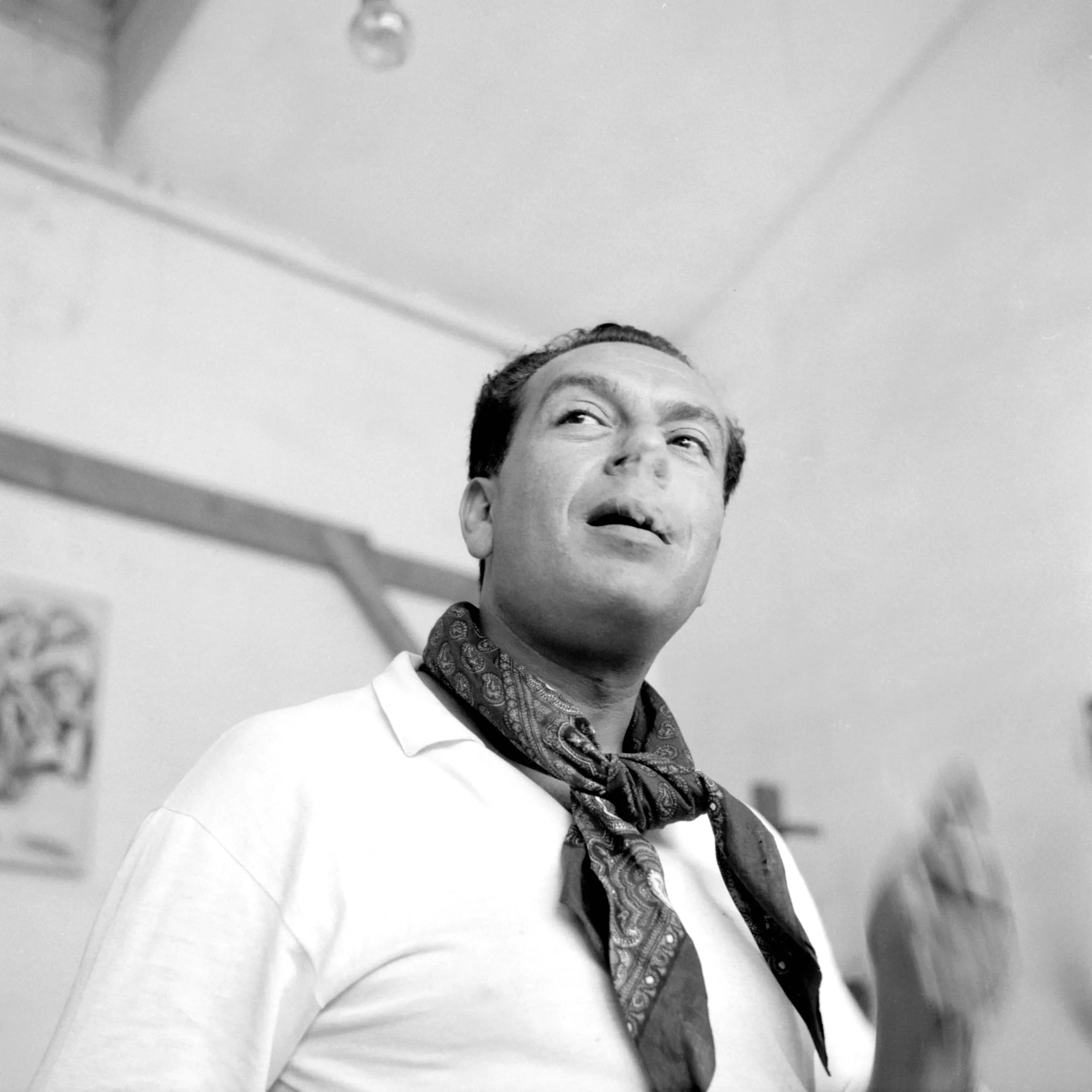 Black and white photograph of a man from the chest up, shot from a low angle, head tilted back with lips parted, wearing a paisley scarf and polo shirt, interior space visible behind him