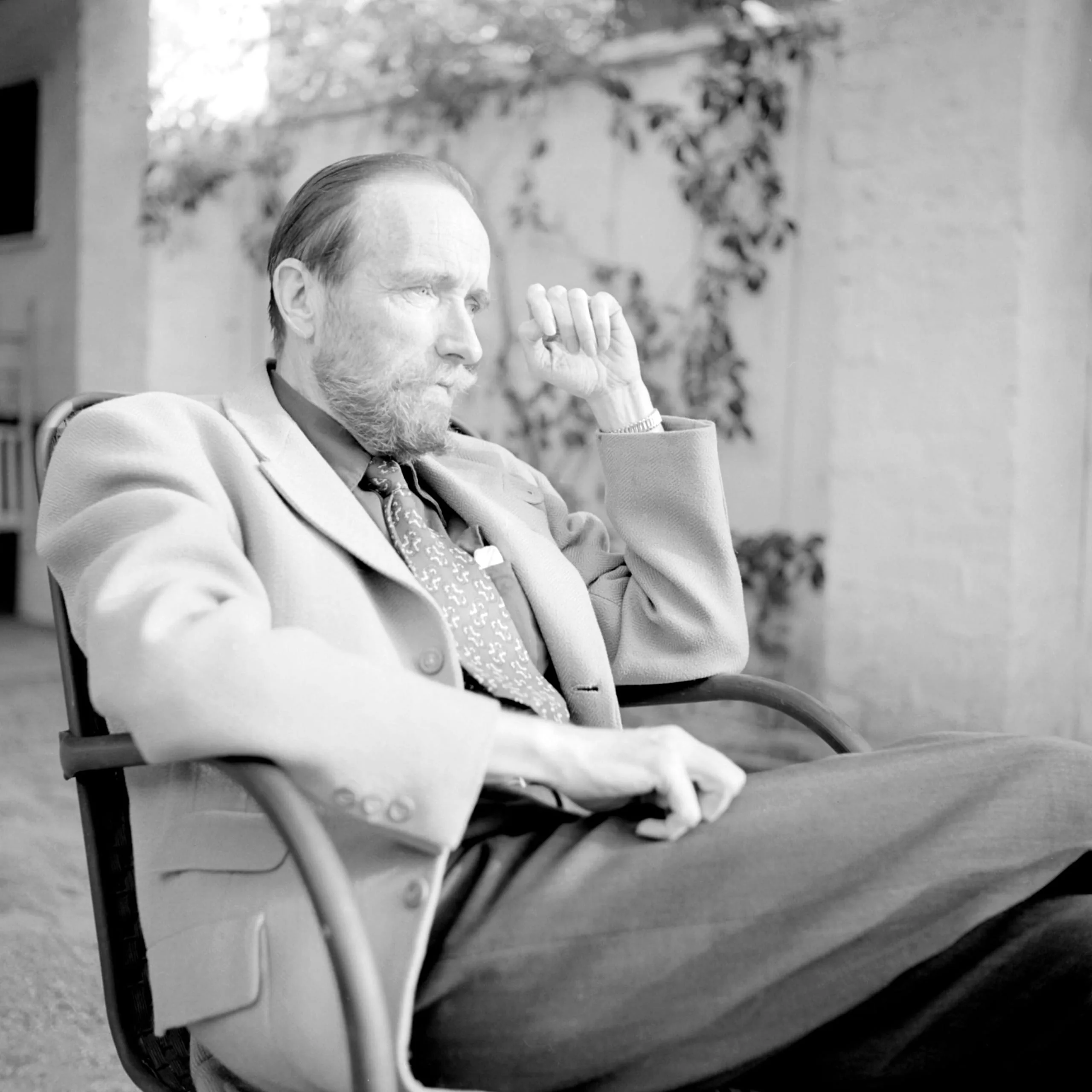 Black and white photograph of a bearded white man in a blazer and tie seated in a low chair, turned in profile to the left with one hand raised near his chin