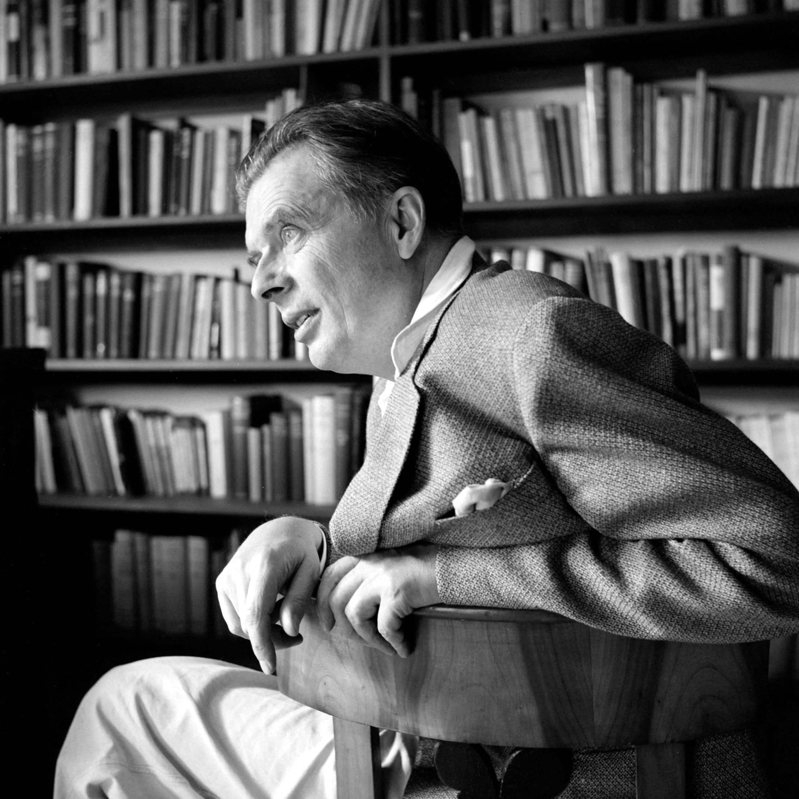 Black and white photograph, a white man in a tweed sport coat seated and leaning forward in profile, bookshelves filling the background