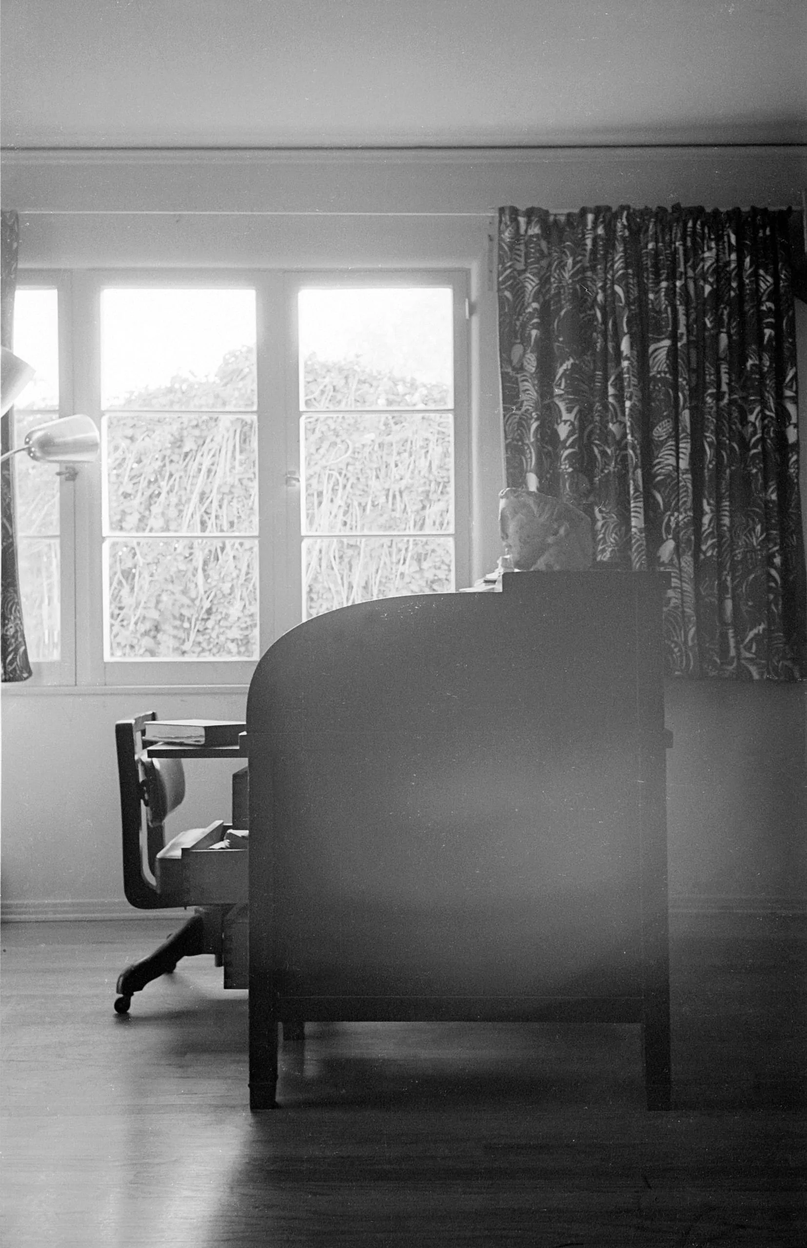 Black and white photograph of a room interior with a rounded upholstered chair in the foreground, a desk with lamp to the left, and a bright window overlooking bare shrubs, with a patterned curtain to the right