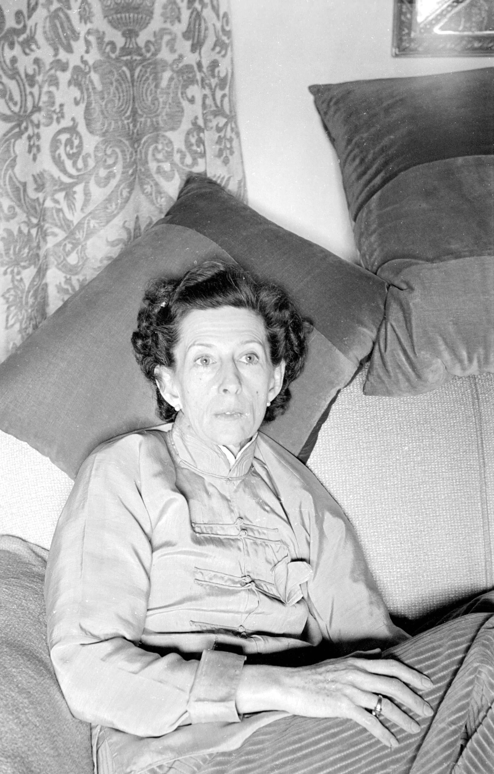 Black and white photograph of a white woman with short dark hair seated against large cushions on a sofa, wearing a light satin blouse, looking directly at the camera