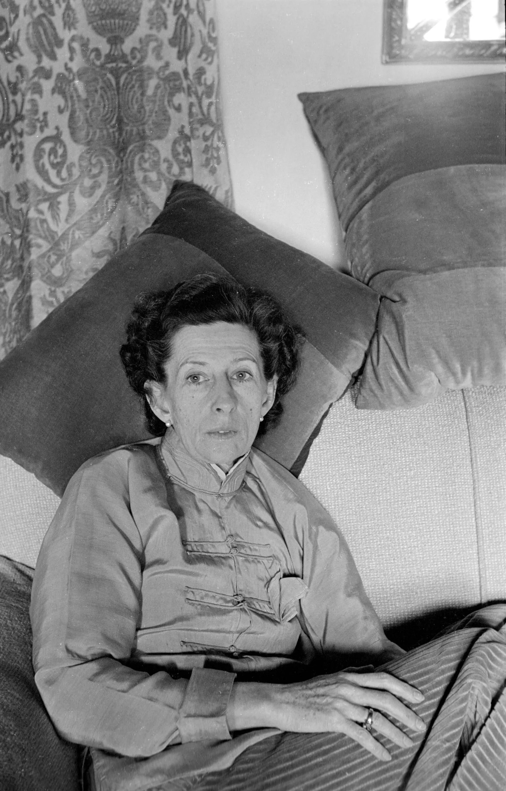 Black and white photograph of a woman reclining on a sofa with large cushions, wearing a mandarin-collar jacket with frog closures, looking directly at the camera