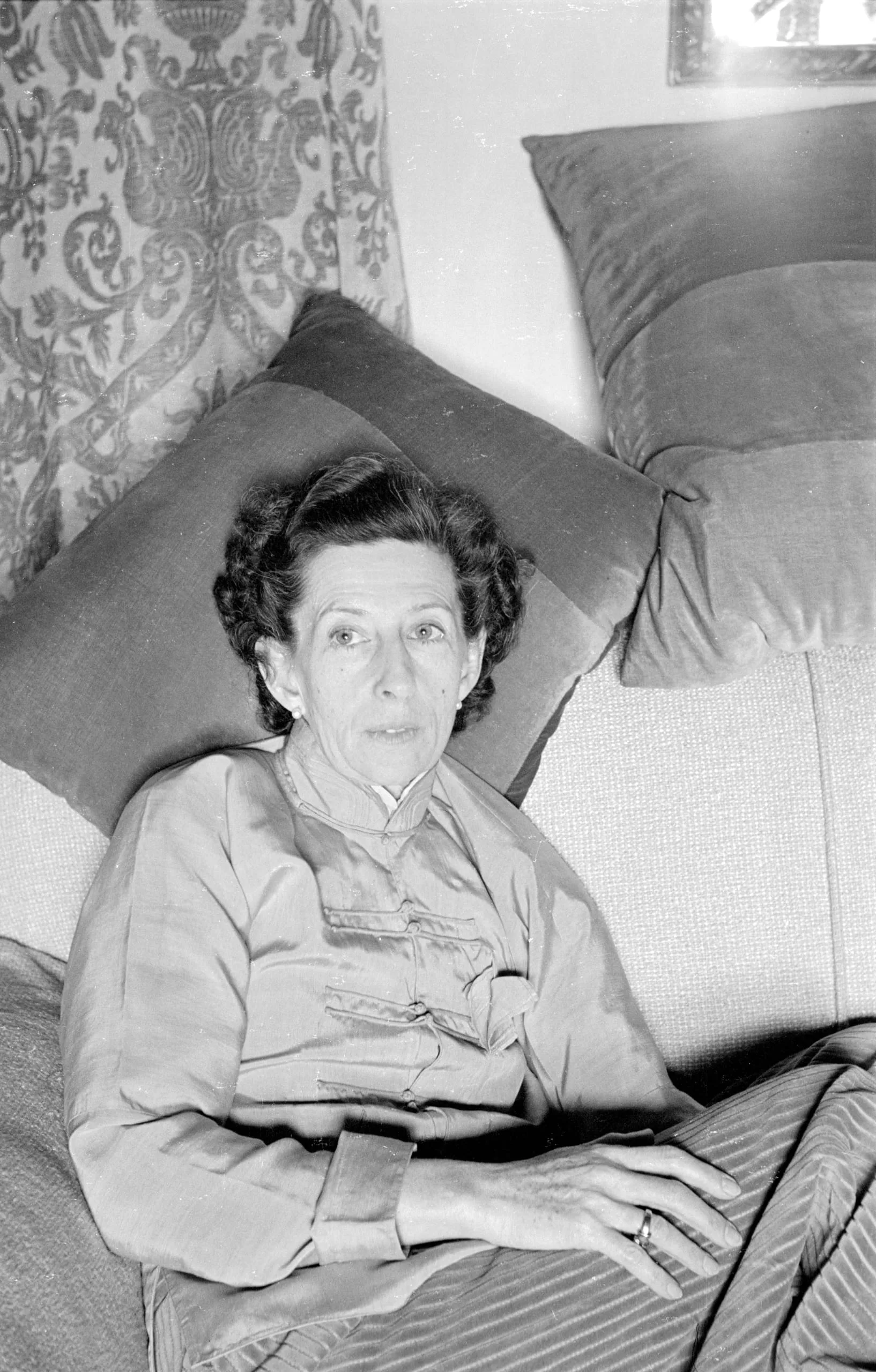 Black and white photograph, a middle-aged white woman in a satin blouse seated on a cushioned sofa, looking directly at the camera