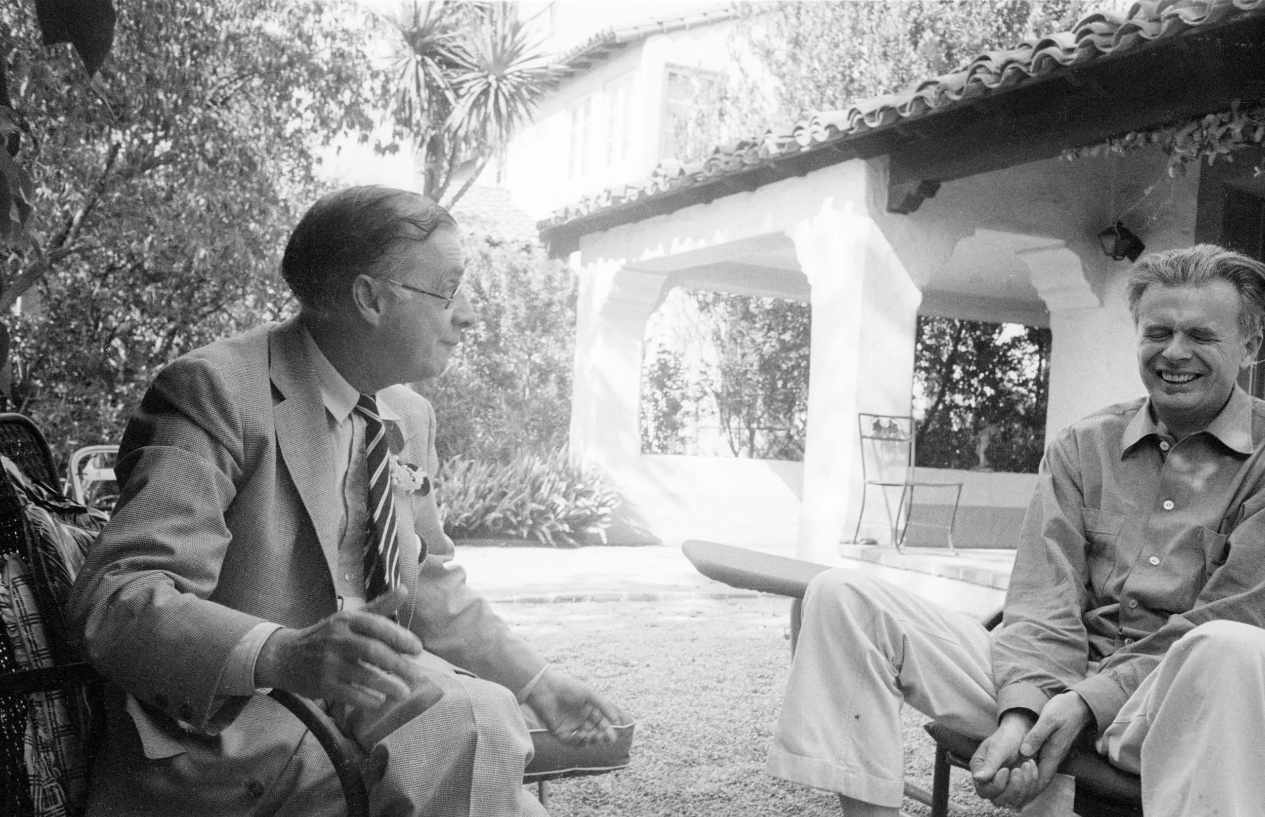 Black and white photograph of two men seated outdoors in conversation, one in a suit and tie, the other in a casual shirt, with a white stucco building and trees behind them