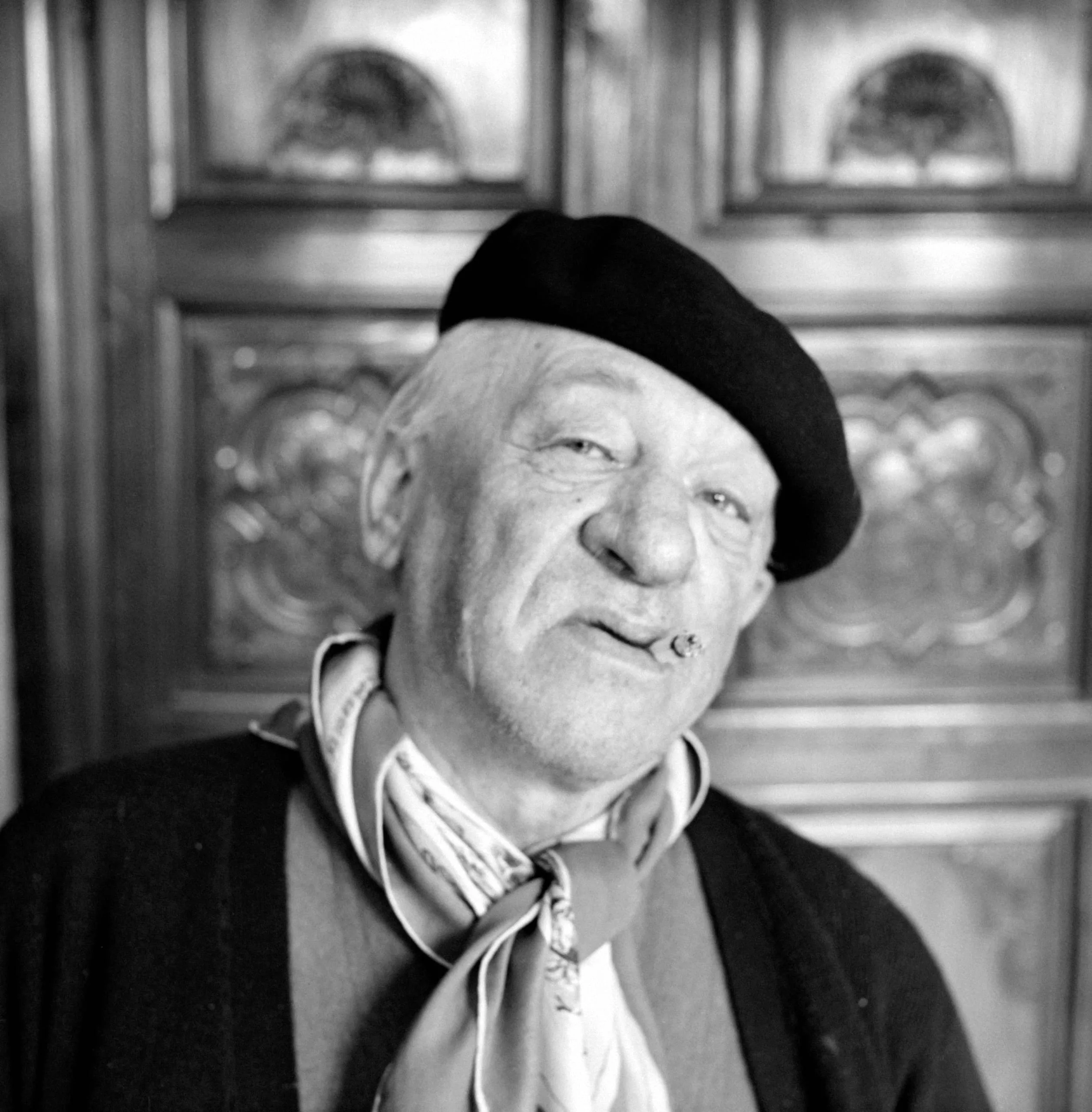 Black and white portrait photograph of an older white man in a black beret with a cigar at his lips and a loosely knotted scarf, before an ornate carved wooden door