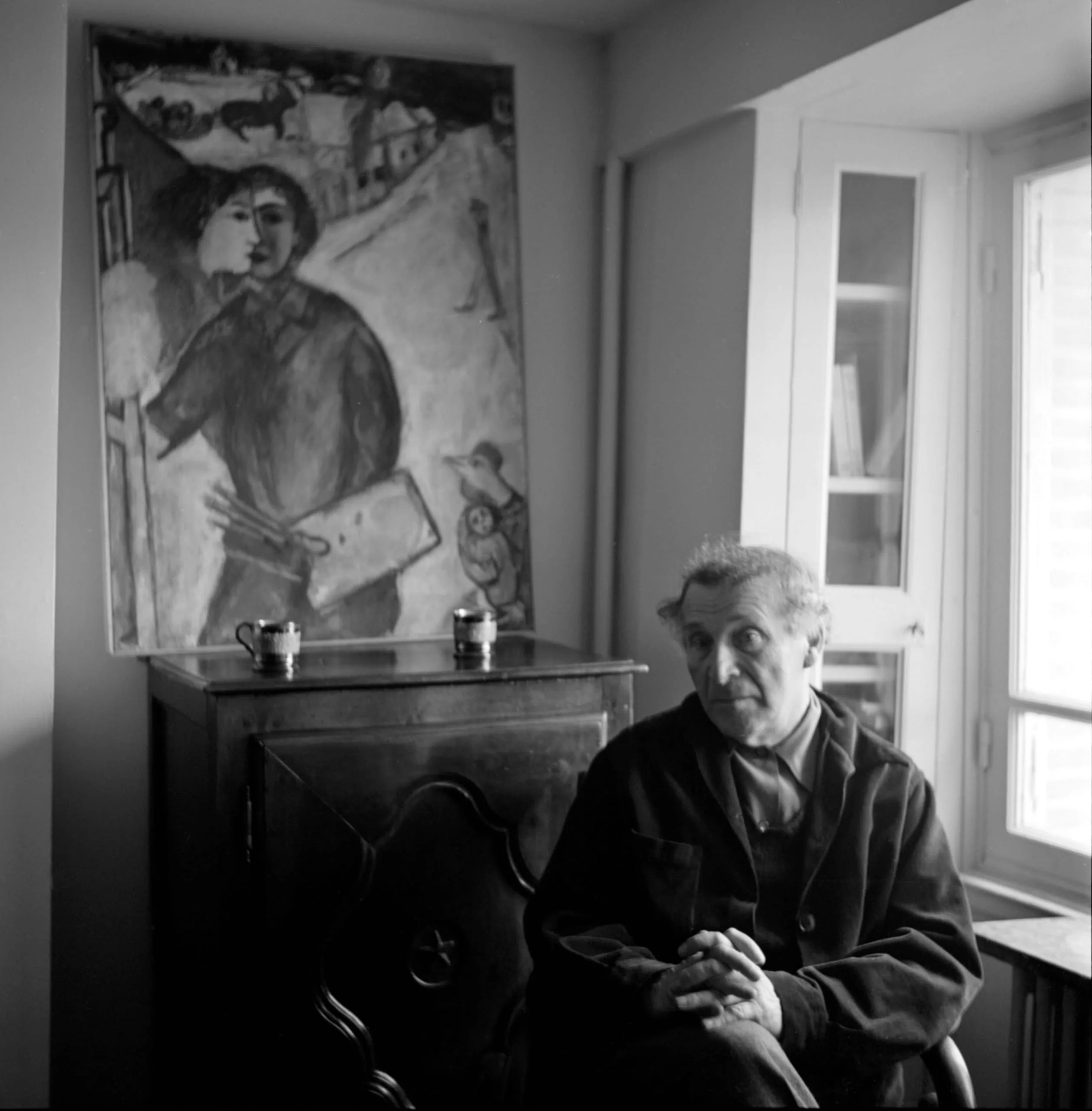Black and white photograph of an elderly man seated in a chair, hands clasped, beside a dark wooden cabinet with a large figurative painting hanging above it