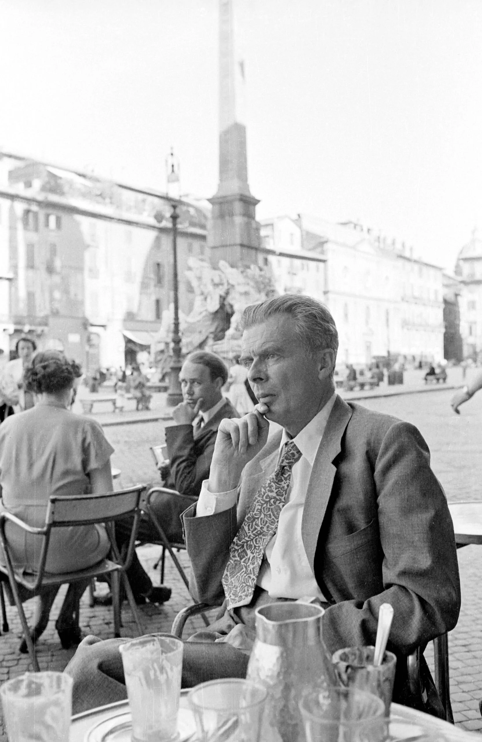 Black and white photograph of a gray-haired white man in a suit and patterned tie seated at an outdoor café table, holding a cigar, with a plaza obelisk visible behind him