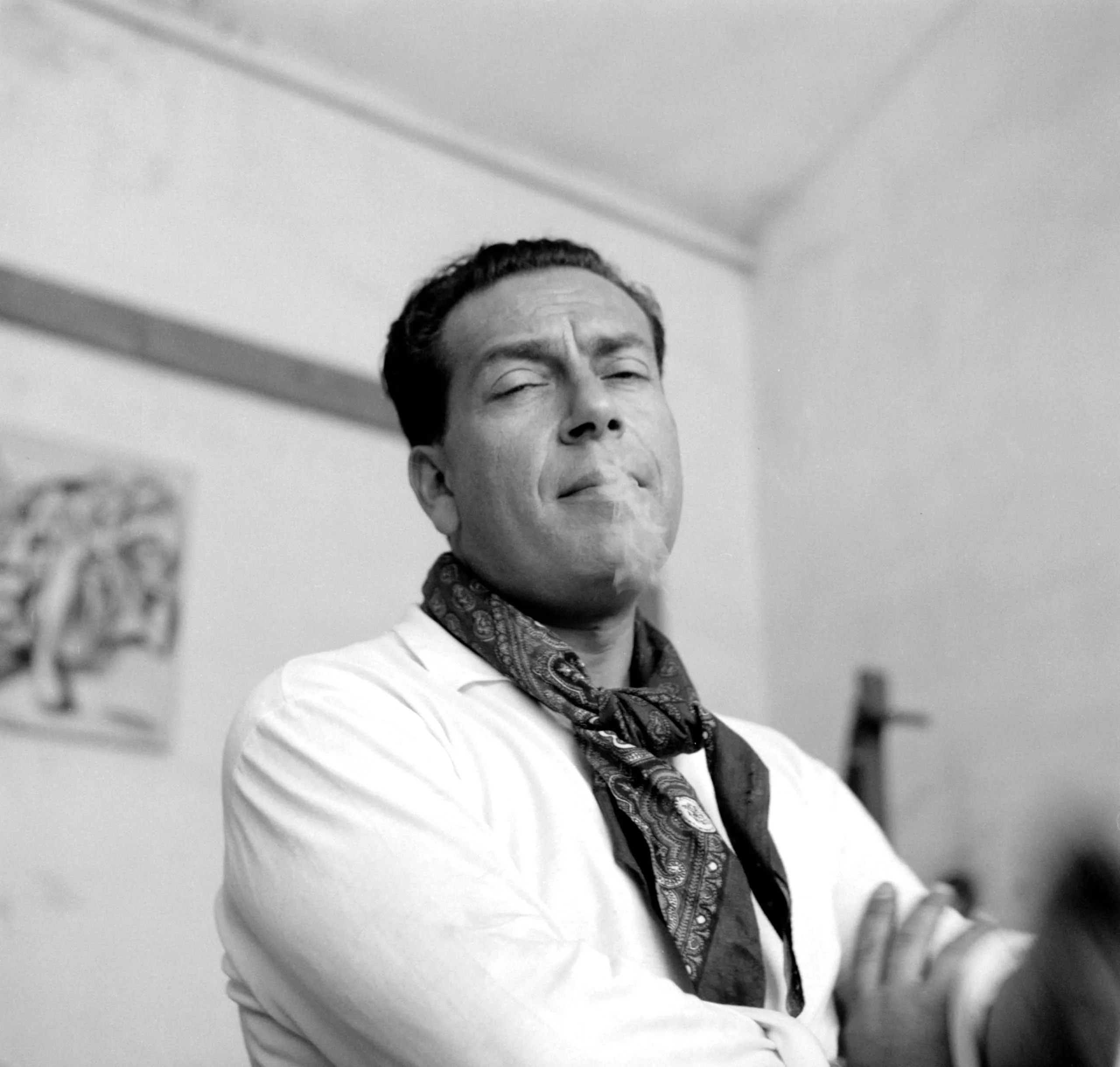 Black and white photograph, close-up portrait of a man in a white shirt and paisley scarf, arms crossed, head tilted back, smoke rising from parted lips