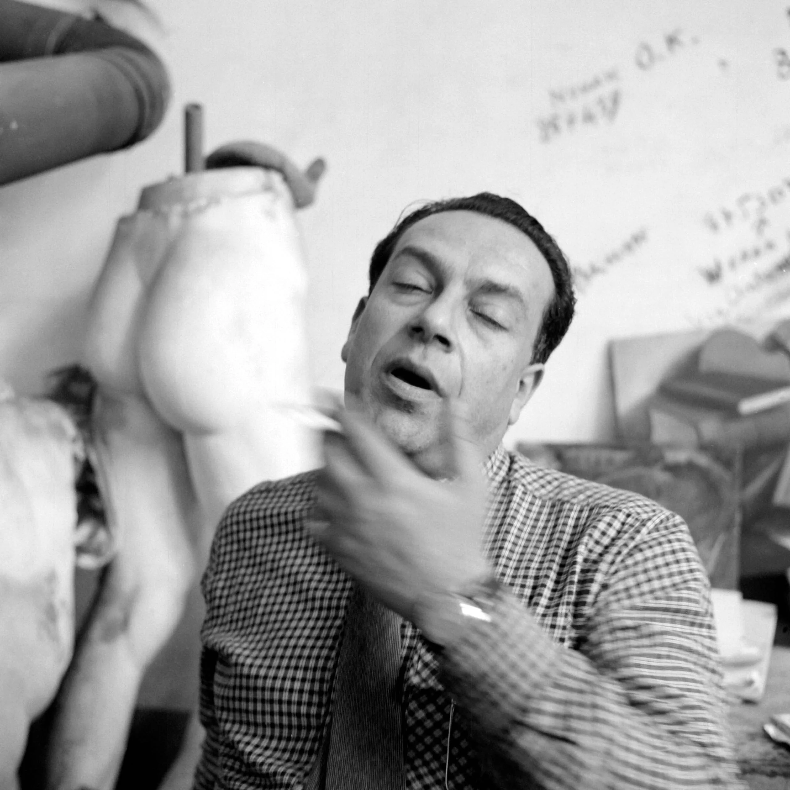 Black and white photograph of a man in a plaid shirt leaning toward a pale sculptural form, one hand raised and slightly blurred, with handwritten wall markings behind him