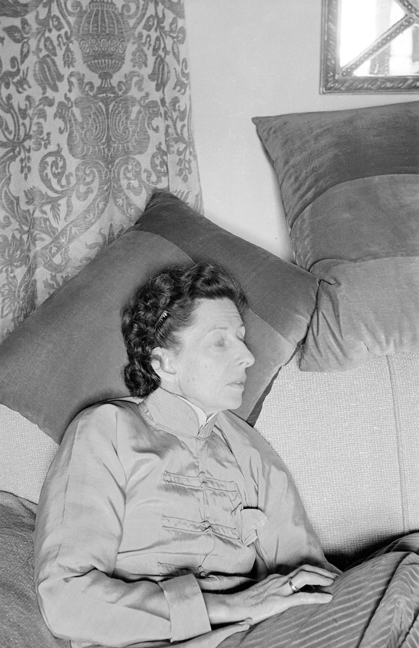 Black and white photograph of a dark-haired white woman in a satin bed jacket, reclining against large pillows, looking to the right in profile