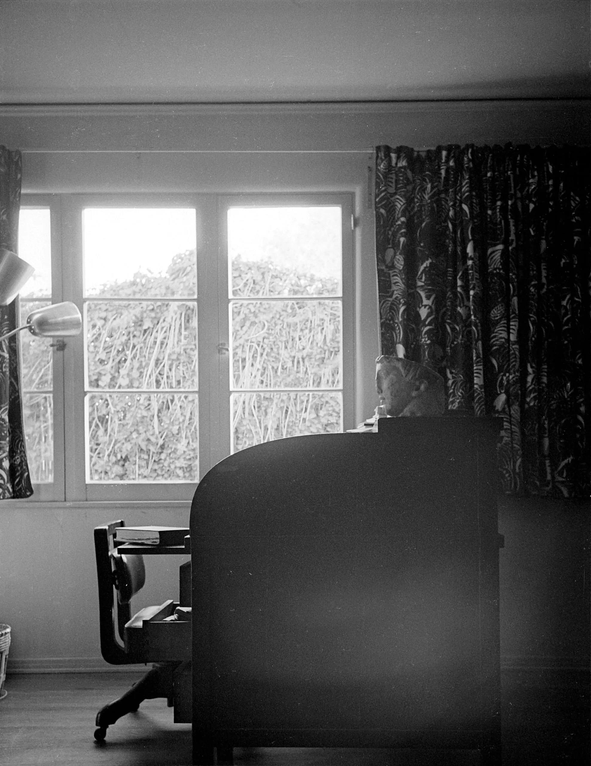 Black and white photograph of a room interior with a grand piano lid in the foreground, a desk and lamp to the left, and a bright window overlooking bare branches