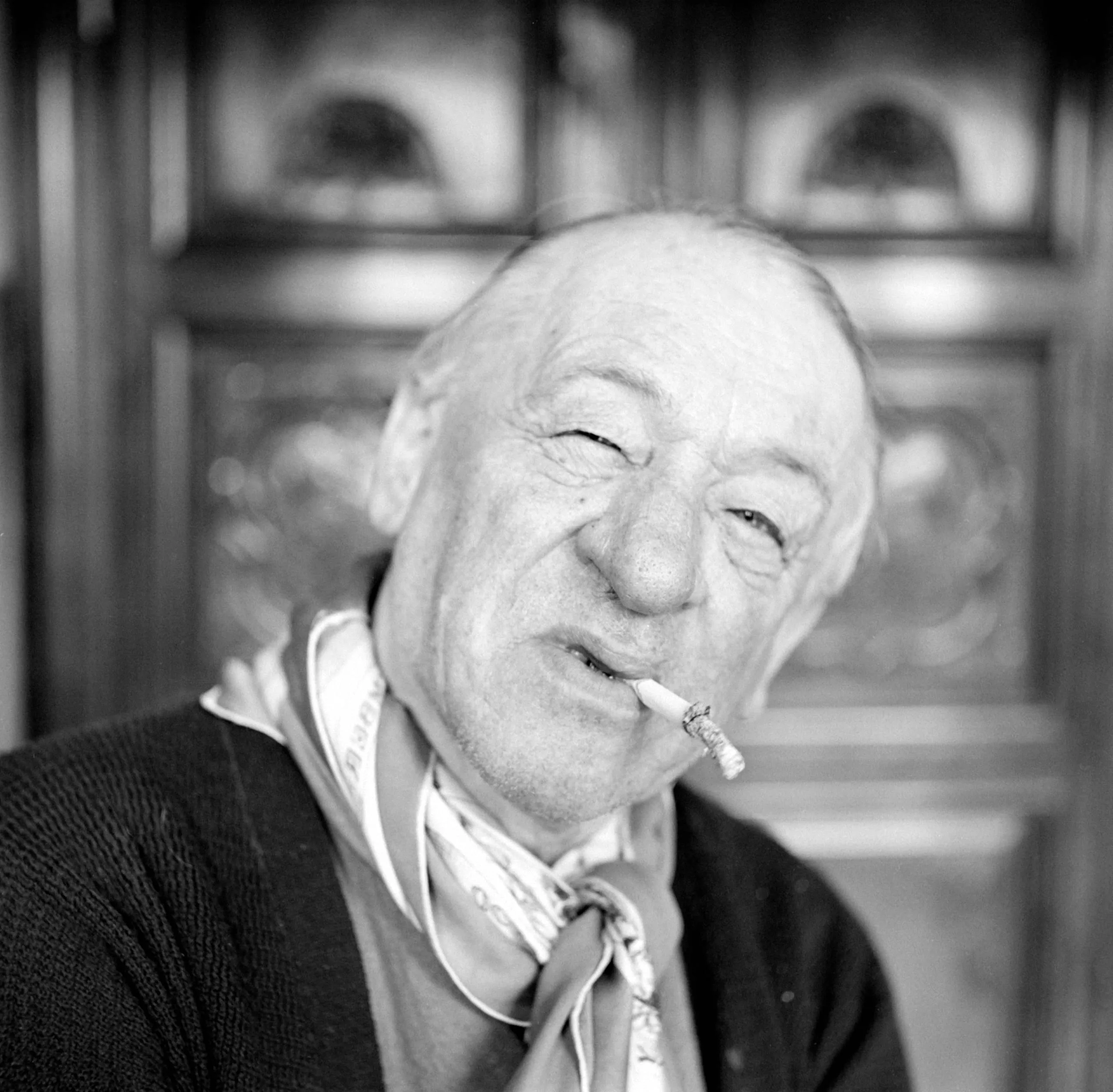 Black and white portrait photograph of an elderly man, chest up, cigarette in mouth, wearing a dark cardigan and loosely knotted patterned scarf