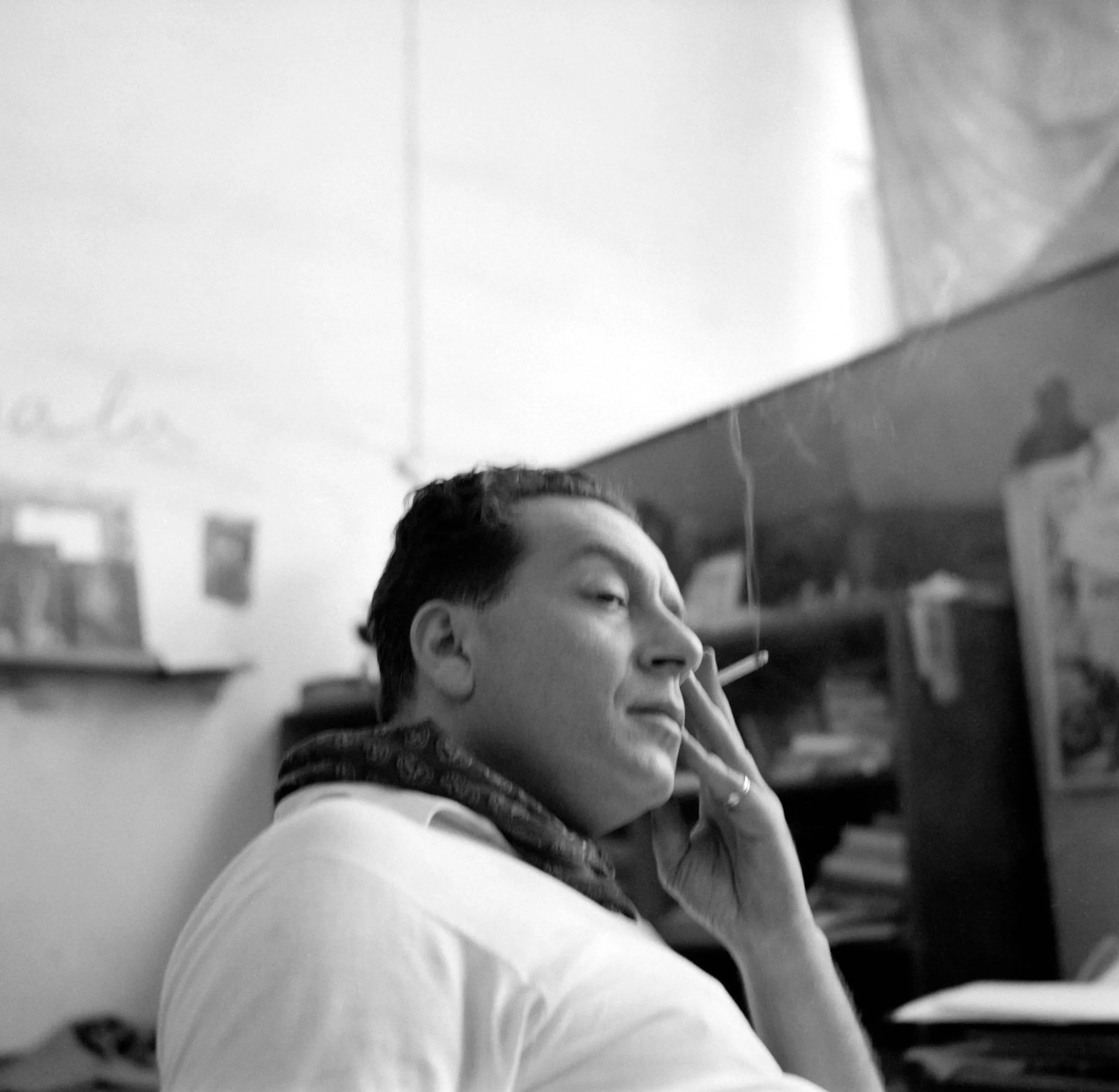 Black and white photograph, man in profile to the right, holding a cigarette to his lips, white shirt and scarf, indoor workspace behind him