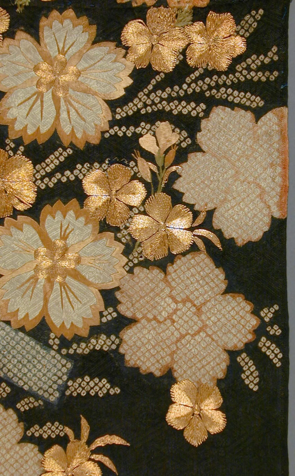 - Silk figured satin (rinzu), tie-resist dyed(kanako shibori), stenciled imitation tie-deyed (kata kanako shibori) with silk and gilt-paper-wrapped silk embroidery