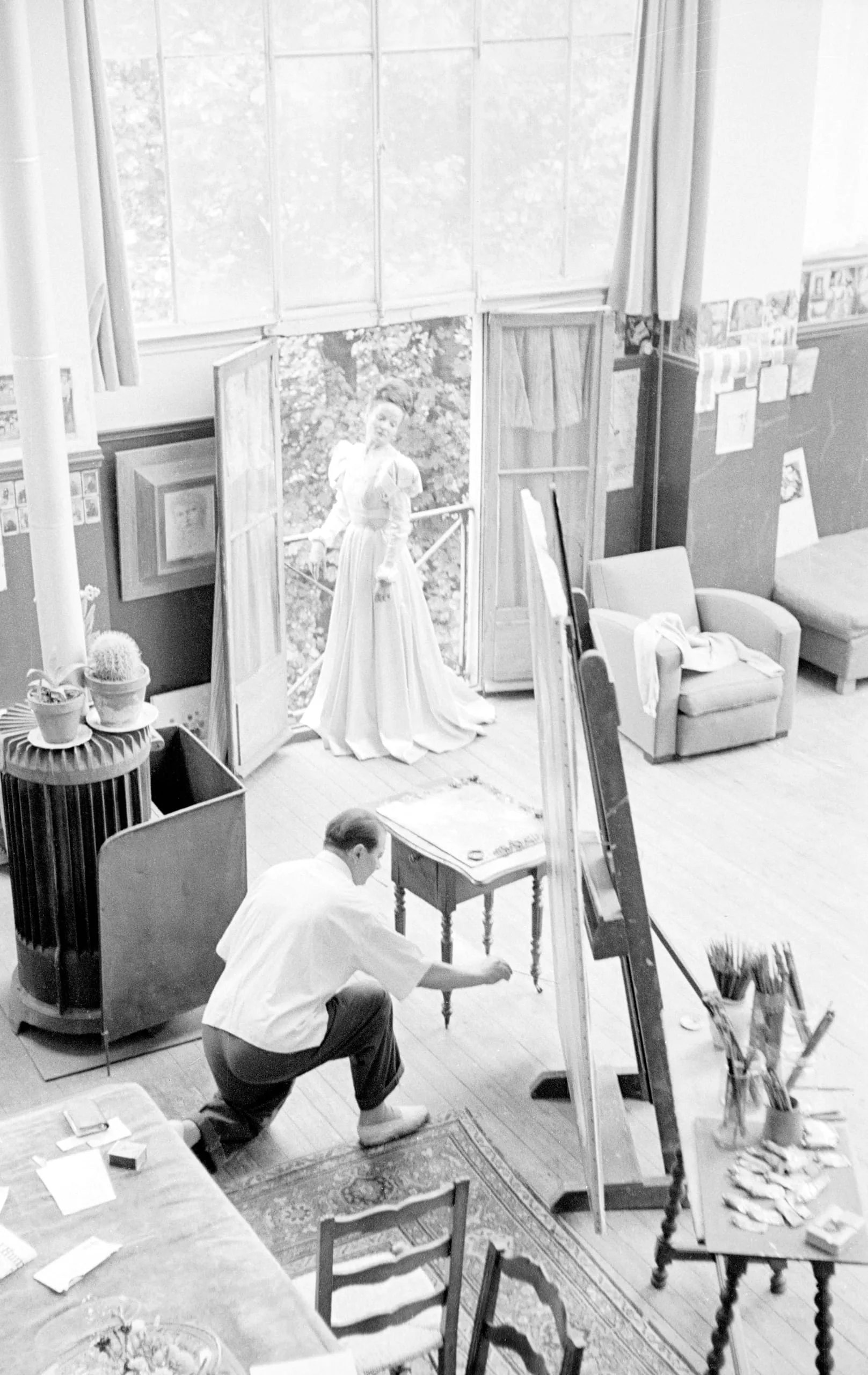 Black and white photograph taken from above, looking down into an artist's studio where a man crouches on the floor near an easel and a woman in a full-length white dress stands in open French doors