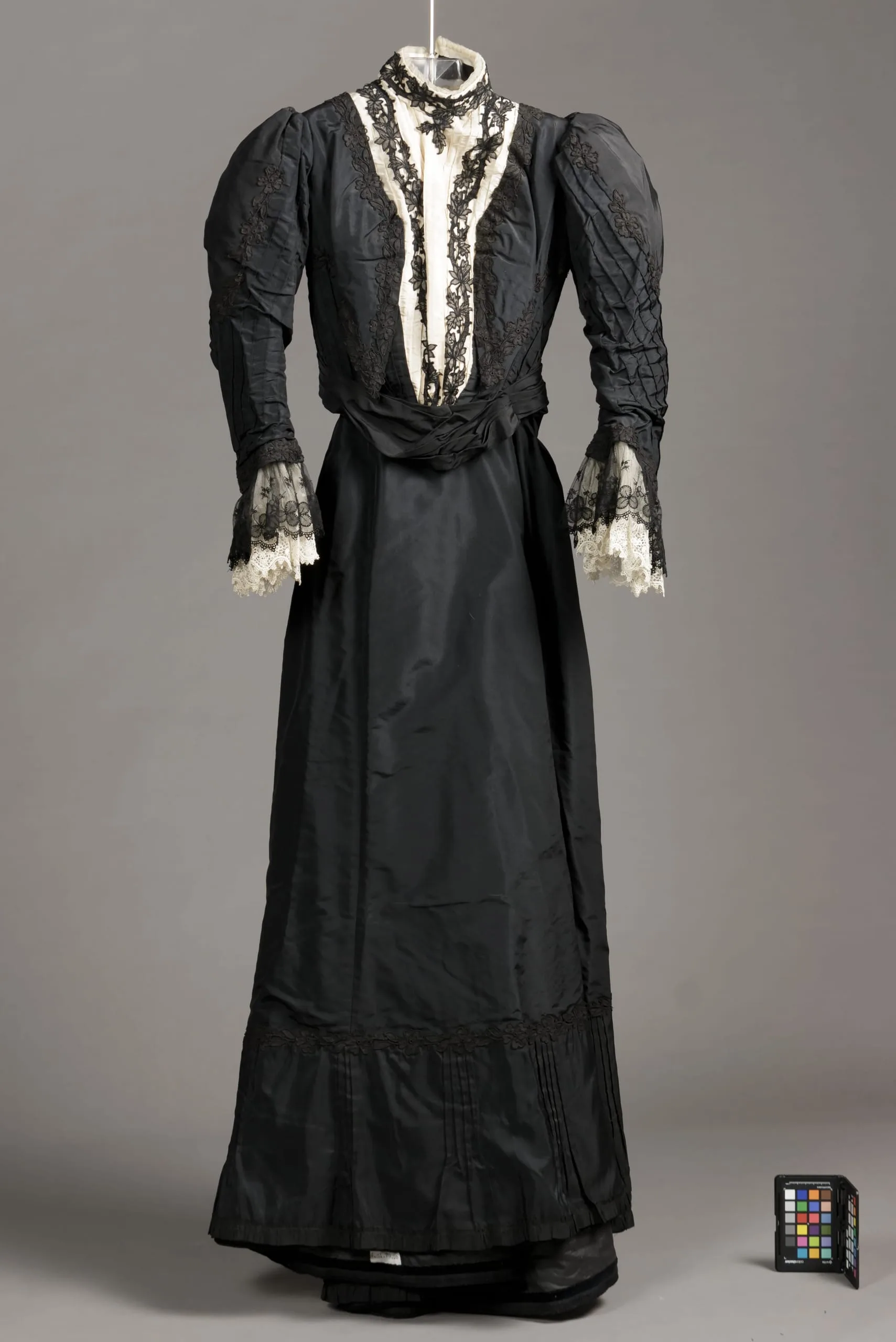 - Bodice: silk plain weave (faille), silk plain weave, silk net, silk lace and silk appliqué; Skirt: silk plain weave (faille) and silk appliqué