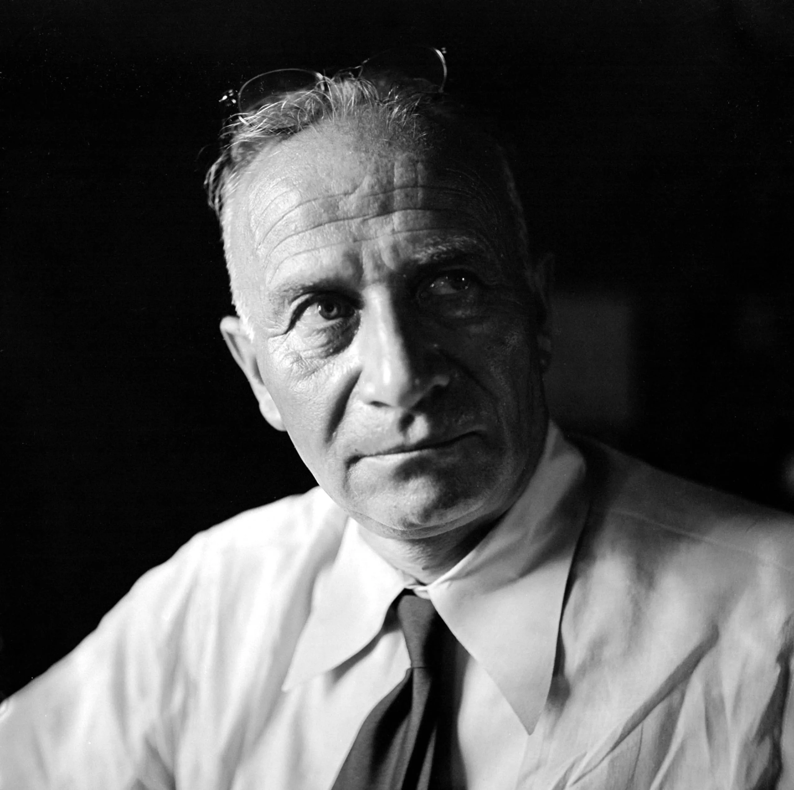 Black and white portrait photograph, white man from the chest up, strongly lit from the left against a black background, wearing a white dress shirt and dark tie with glasses pushed up on his forehead