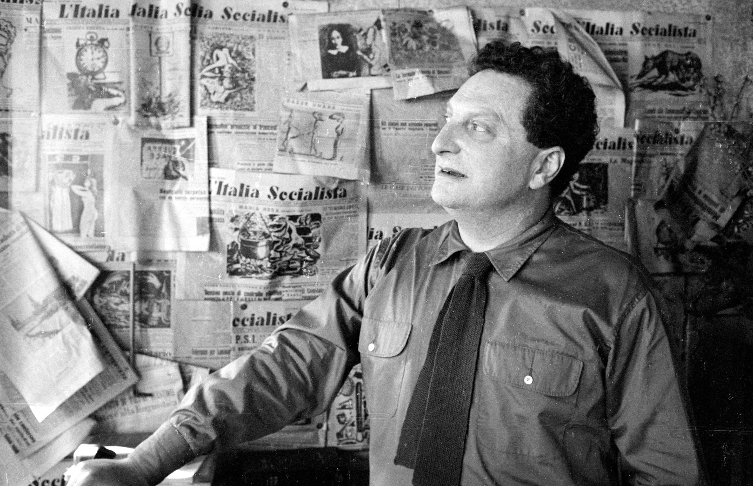 Black and white photograph, man from the waist up angled left, looking upward, dark curly hair and open-collar shirt with tie, standing before a wall covered in Italian newspaper pages