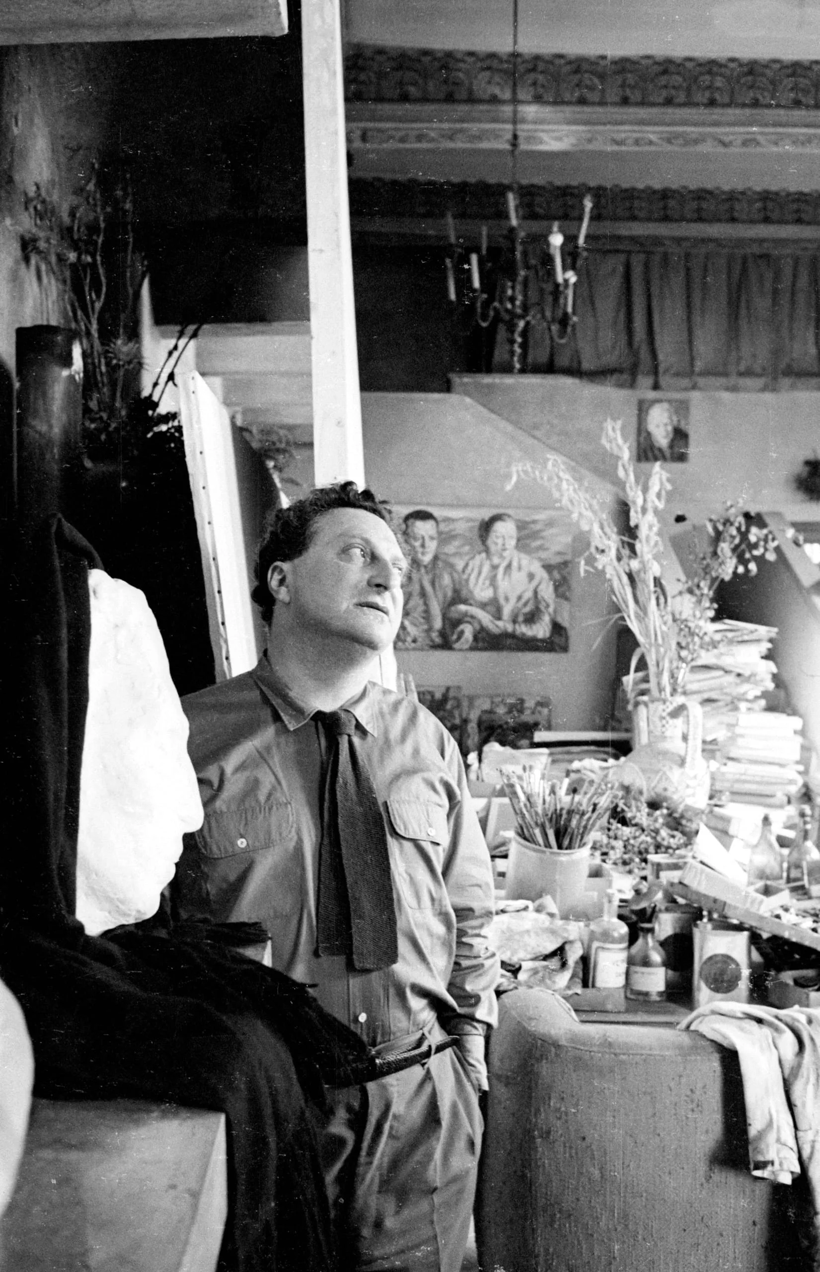 Black and white photograph of a man in a work shirt and loose tie standing in a cluttered artist's studio, head tilted back and gaze directed upward