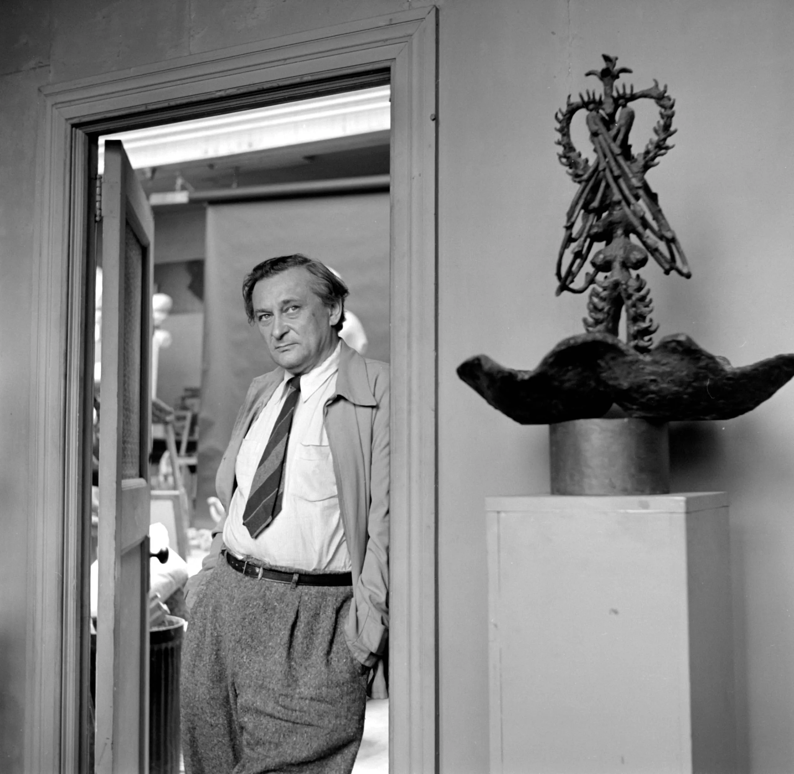 Black and white photograph of a man in a blazer and striped tie standing in an open doorway, a dark sculpture on a white pedestal to his right