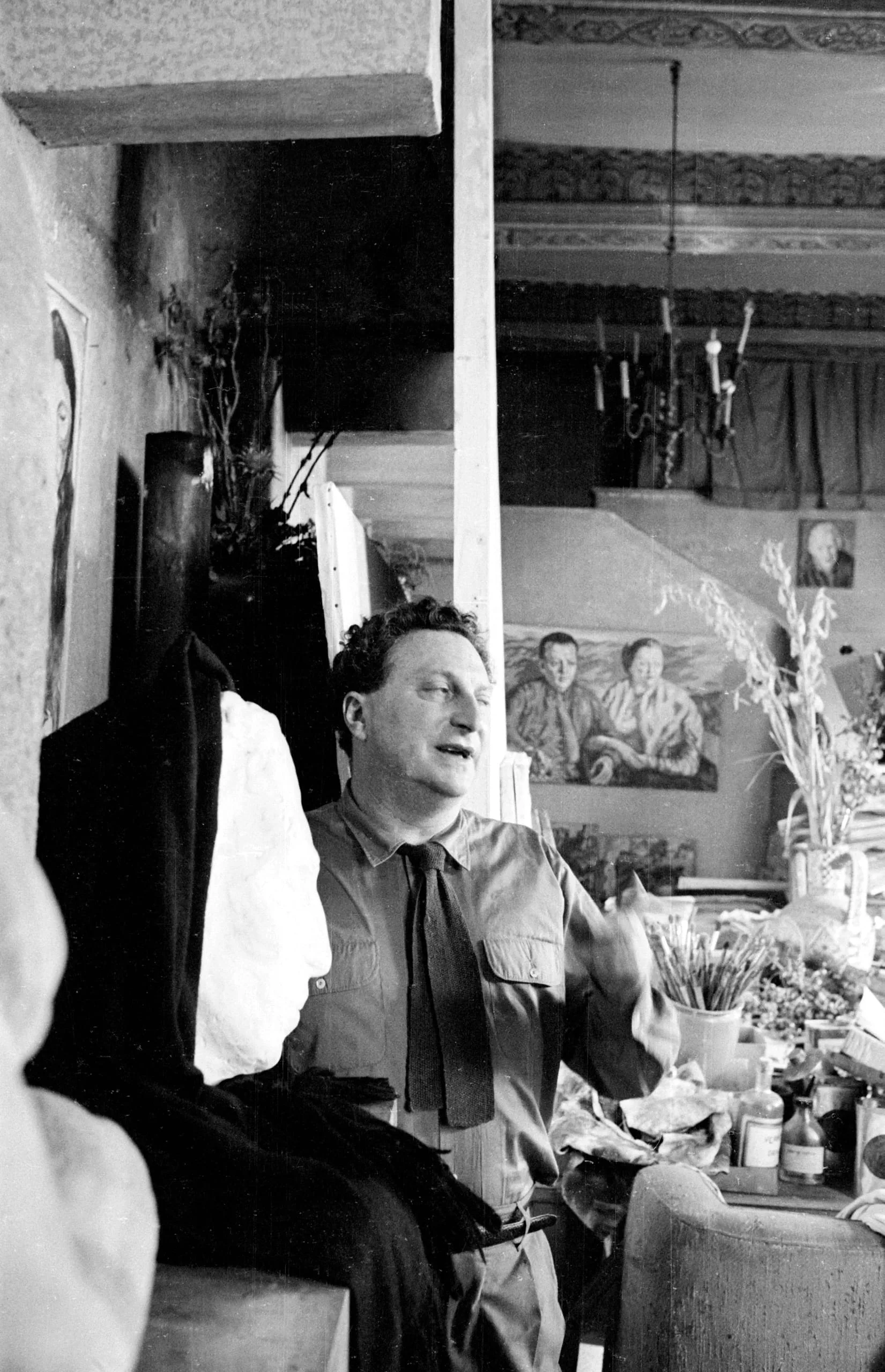 Black and white photograph of a man in a work shirt and loosened tie seated in a cluttered artist's studio, gesturing with one hand, surrounded by paintings and art supplies