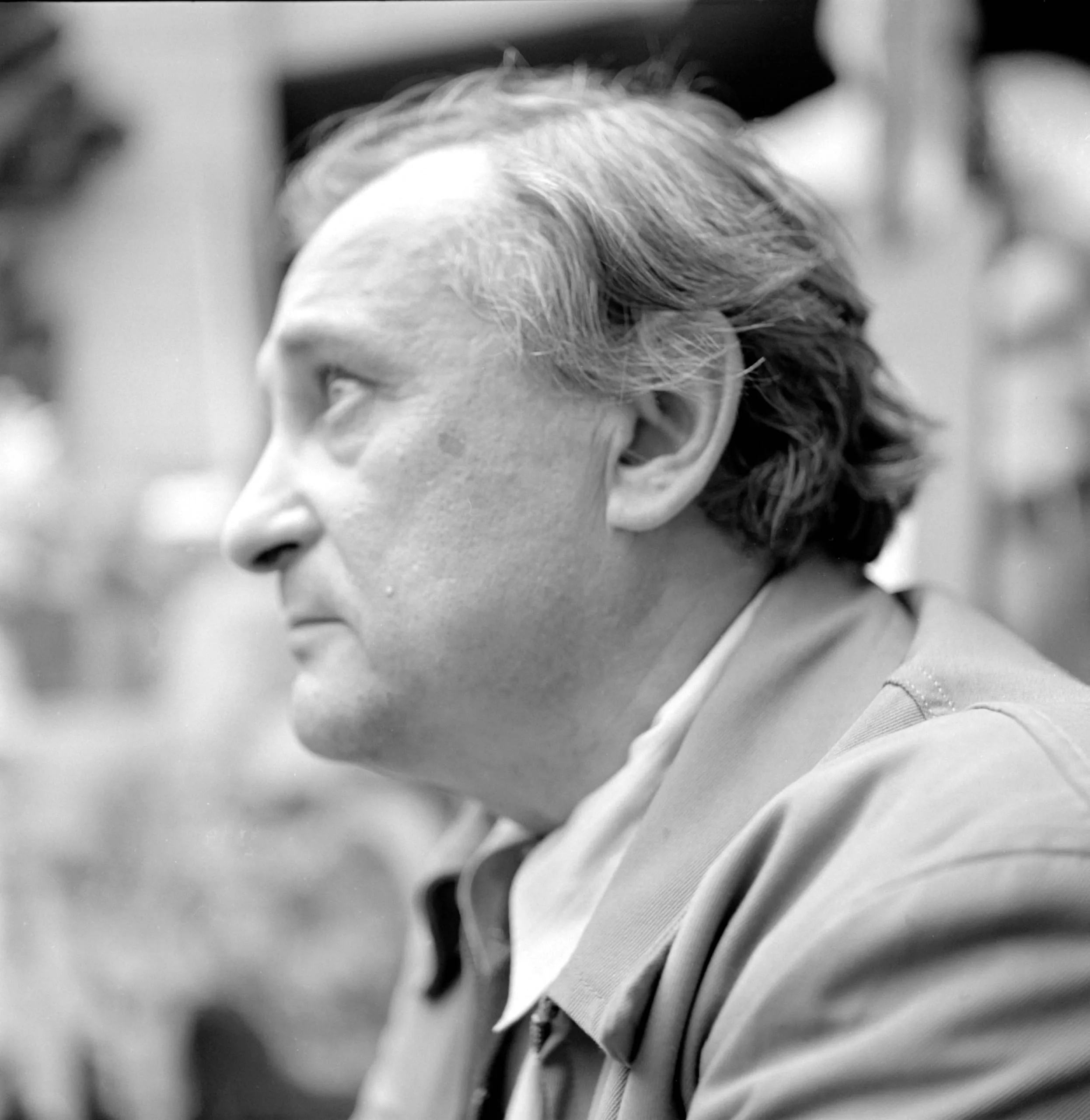 Black and white photograph, close profile of a middle-aged white man with medium-length brown hair, looking upward and to the left, wearing an open-collar jacket