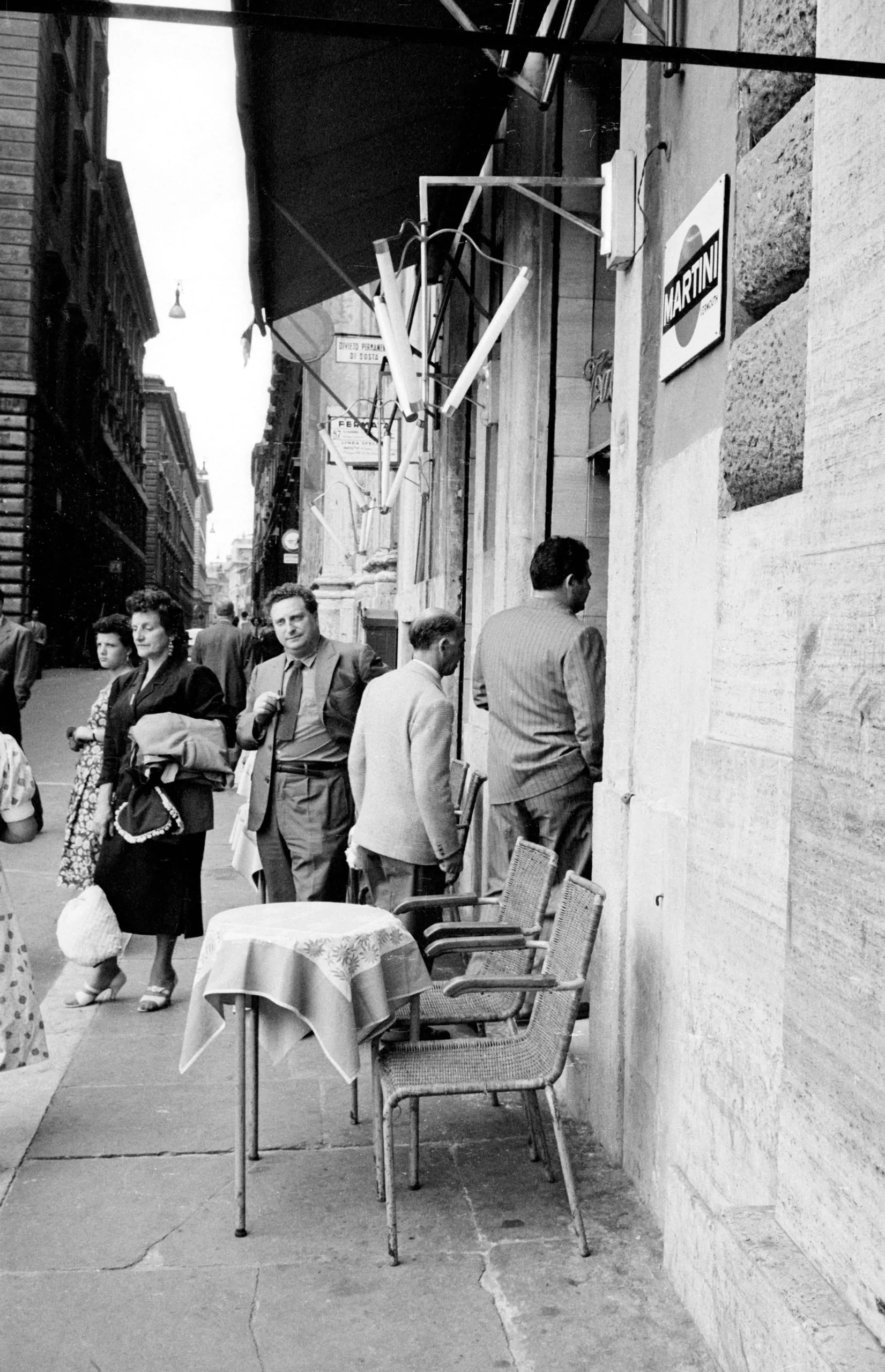 Black and white photograph of a sidewalk café on a narrow European street, with pedestrians passing a cloth-draped table and wicker chairs beneath an awning