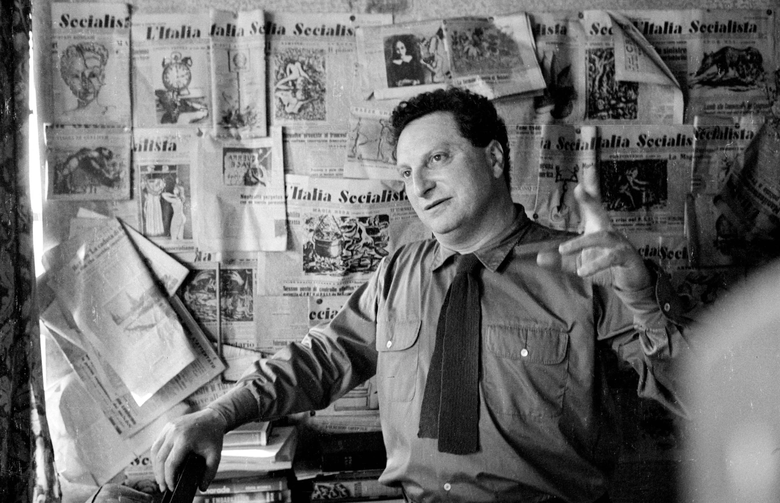 Black and white photograph of a man seated before a wall covered in Italian newspaper pages, raising one finger and holding a folded newspaper