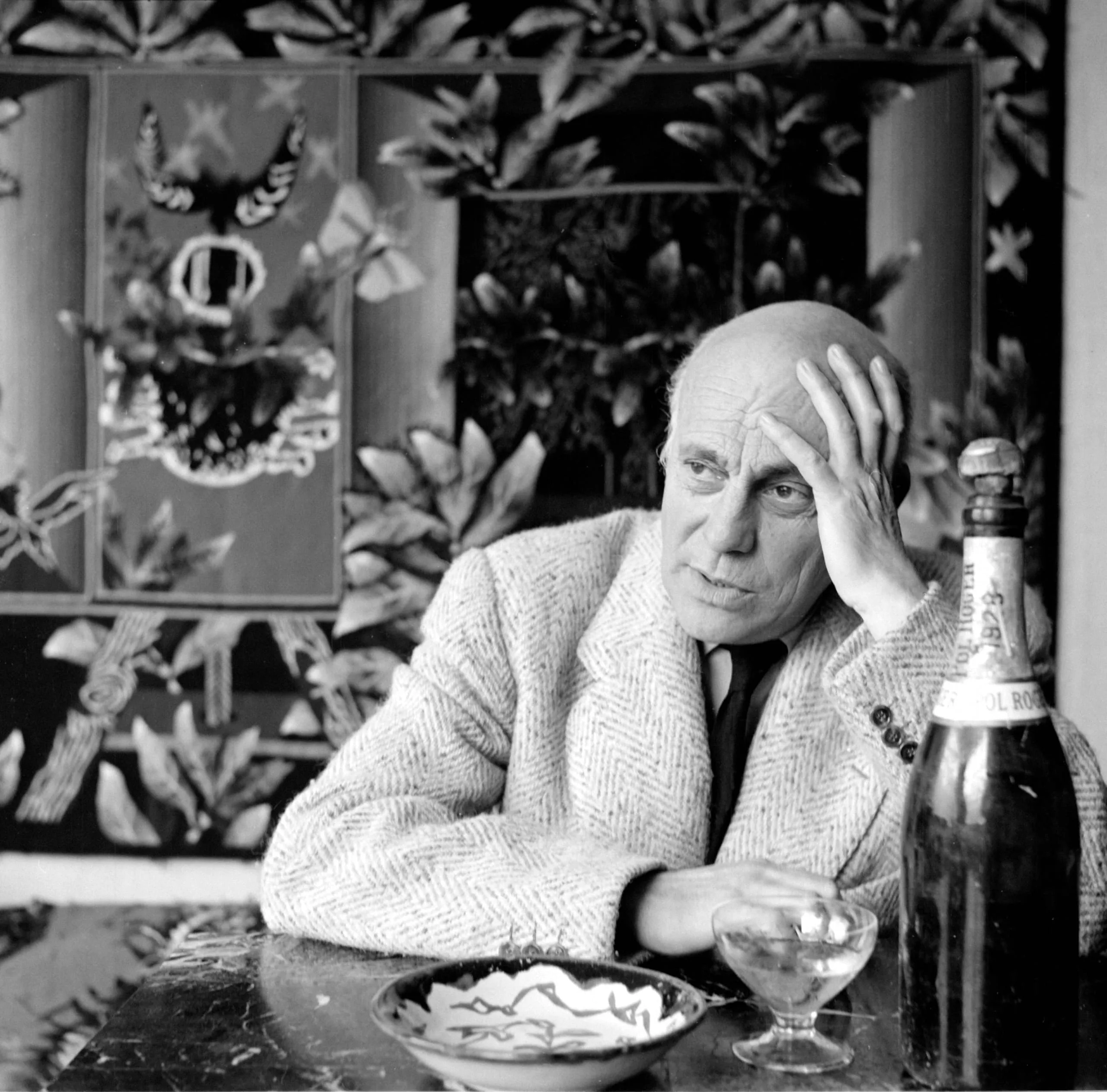 Black and white portrait photograph of an older bald white man in a tweed jacket, leaning his head on one hand at a table with a bottle, glass, and bowl, patterned wall behind him
