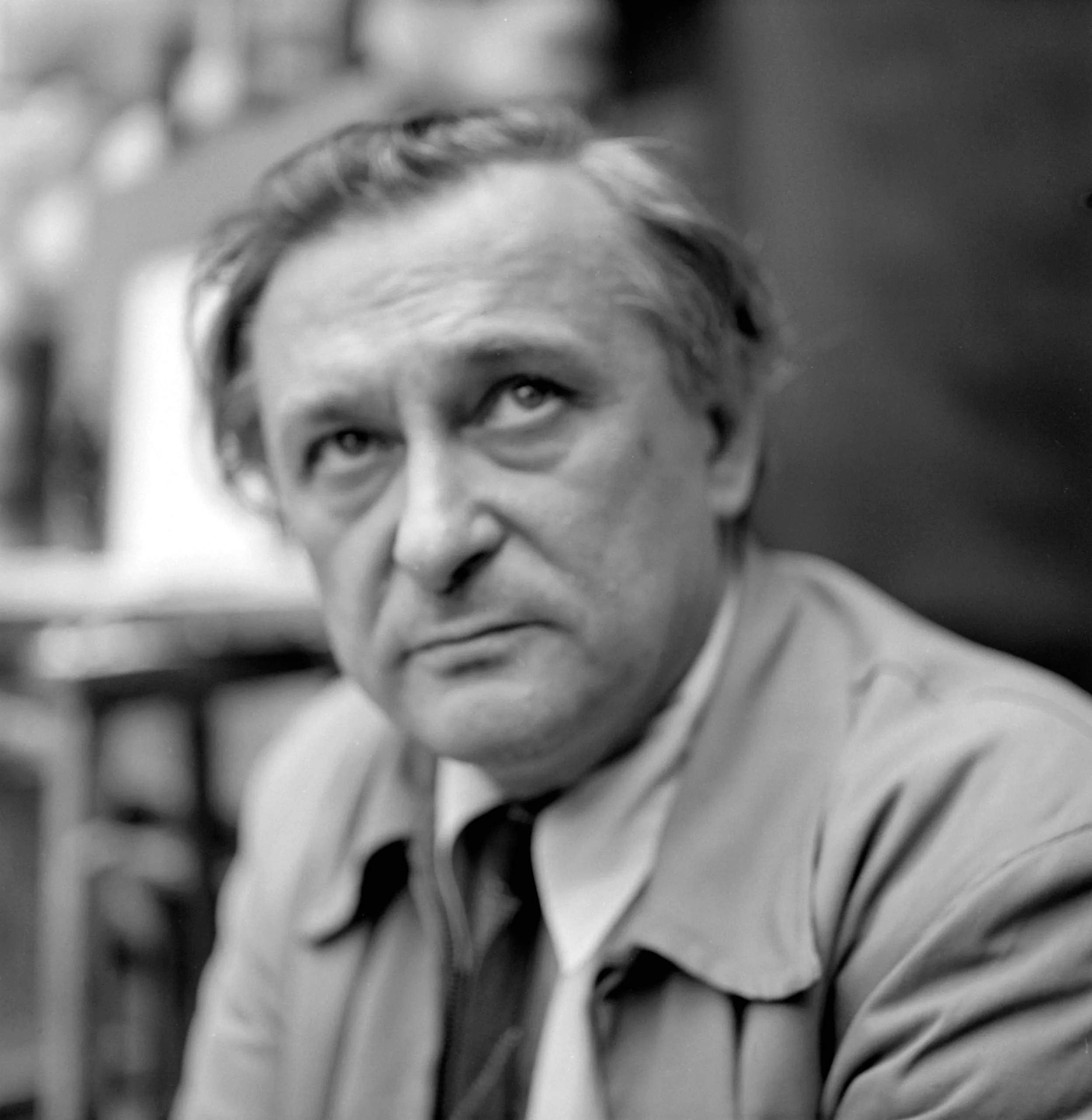Black and white portrait photograph, middle-aged white man in three-quarter profile, chin resting on hand, wearing a jacket and loose tie, softly lit with blurred background