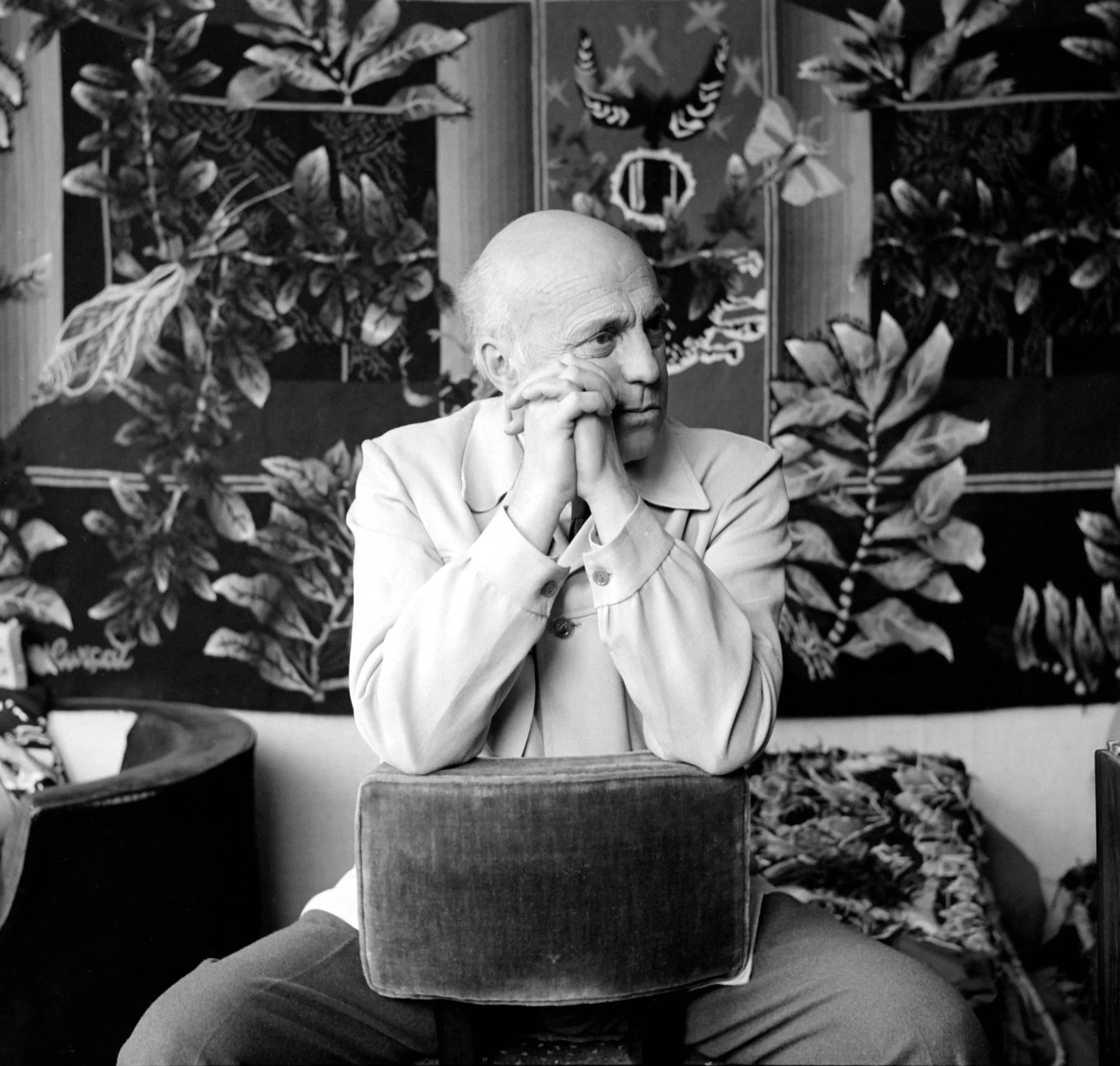 Black and white photograph, older bald man seated with both hands stacked under his chin, wearing a loose light jacket, in front of a large leaf-patterned textile