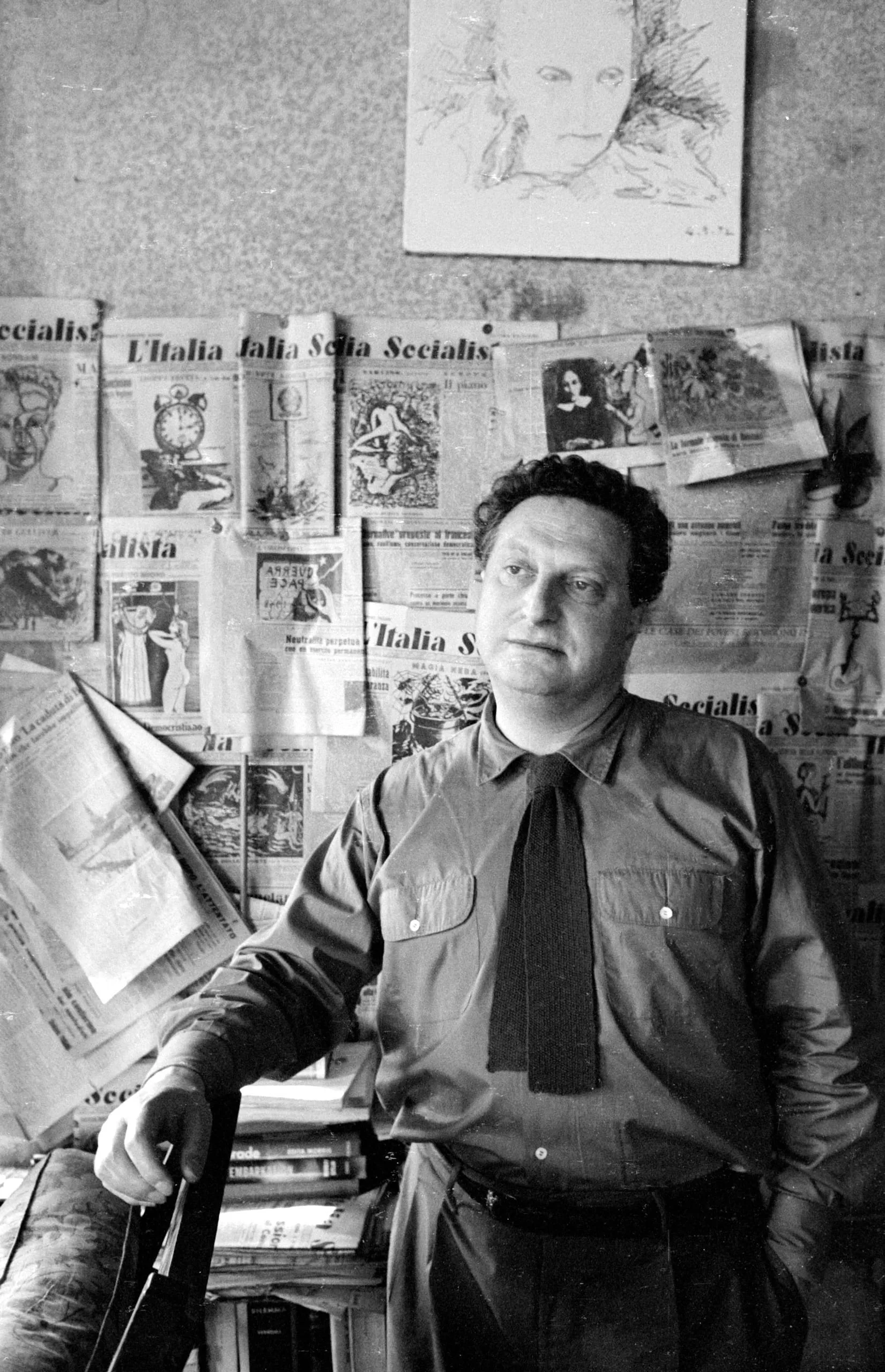 Black and white photograph, portrait of a curly-haired white man seated before a wall covered with Italian-language newspapers, wearing a collared shirt and loose tie