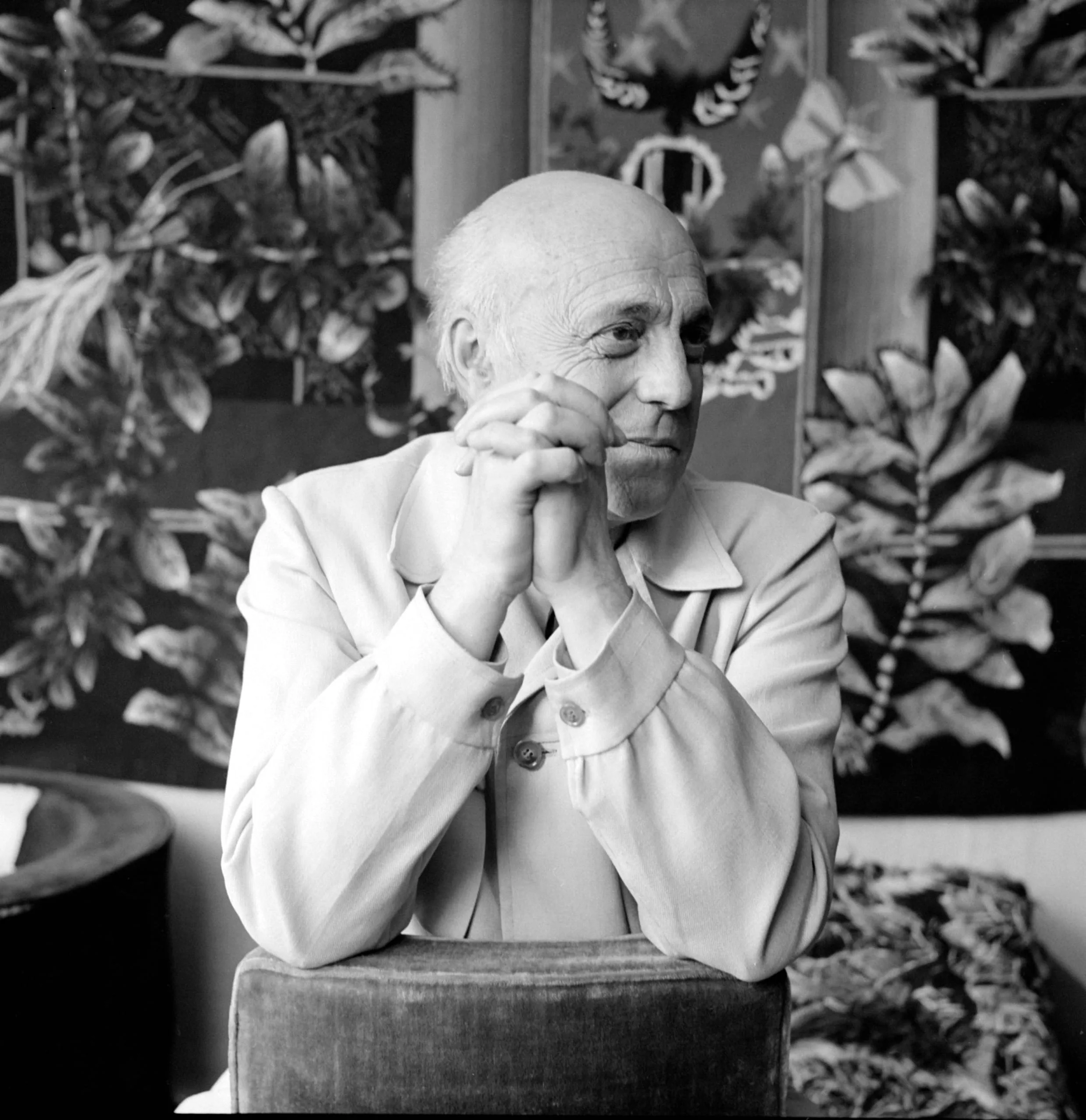 Black and white portrait photograph of an elderly bald man in a light blazer, leaning forward with clasped hands resting under his chin, botanical artwork visible behind him
