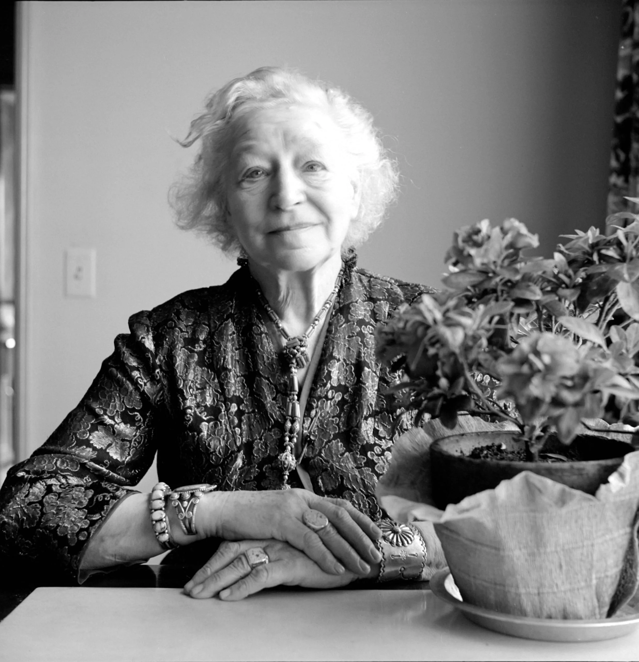 Black and white portrait photograph of an elderly white woman seated at a table, wearing a brocade jacket and stacked bracelets, with a potted plant to her right
