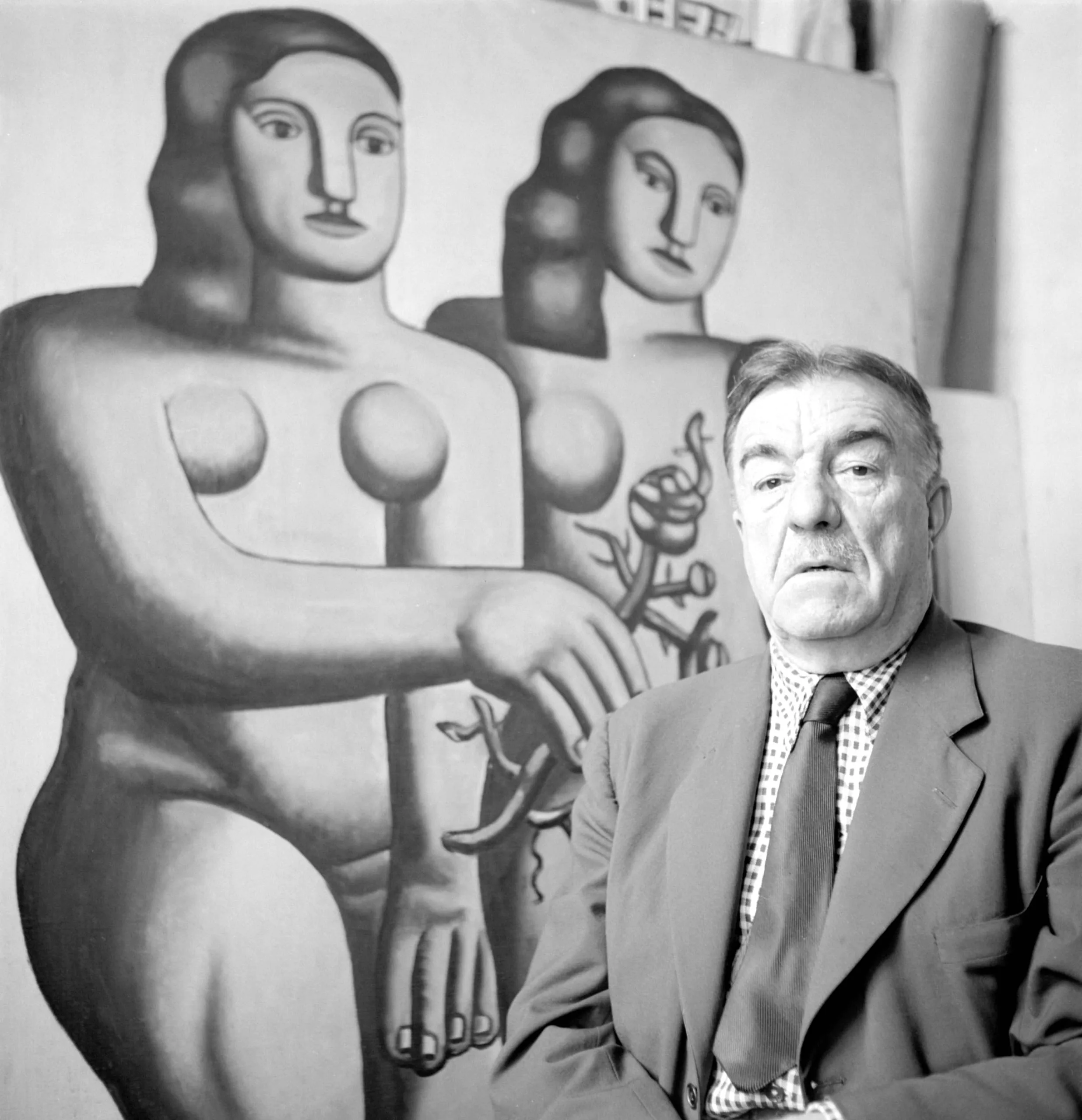 Black and white photograph of an older white man in a suit seated in front of a large modernist painting of two stylized nude female figures