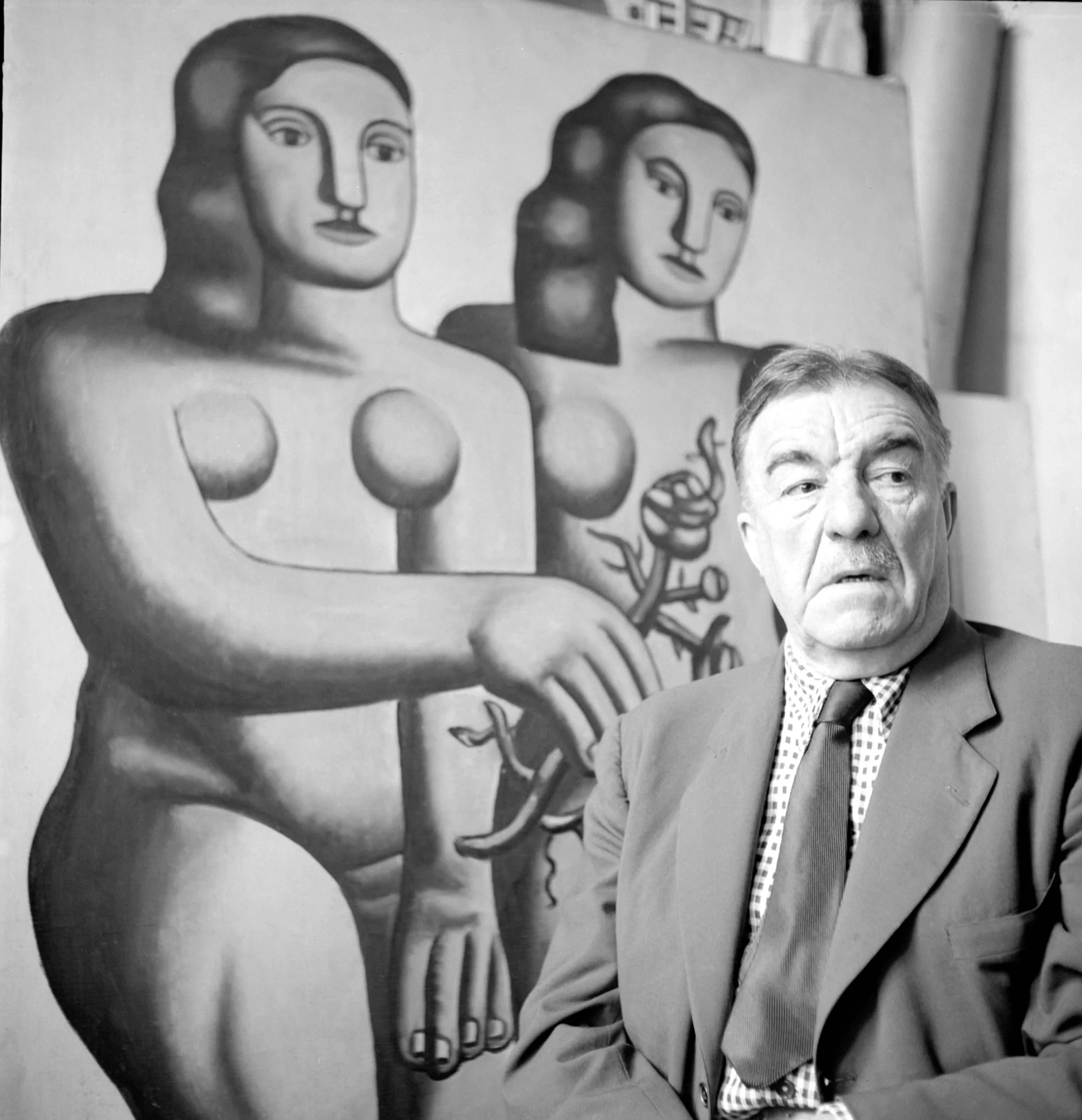 Black and white photograph of an older white man in a suit seated in front of a large painting of two stylized nude figures with bold outlines