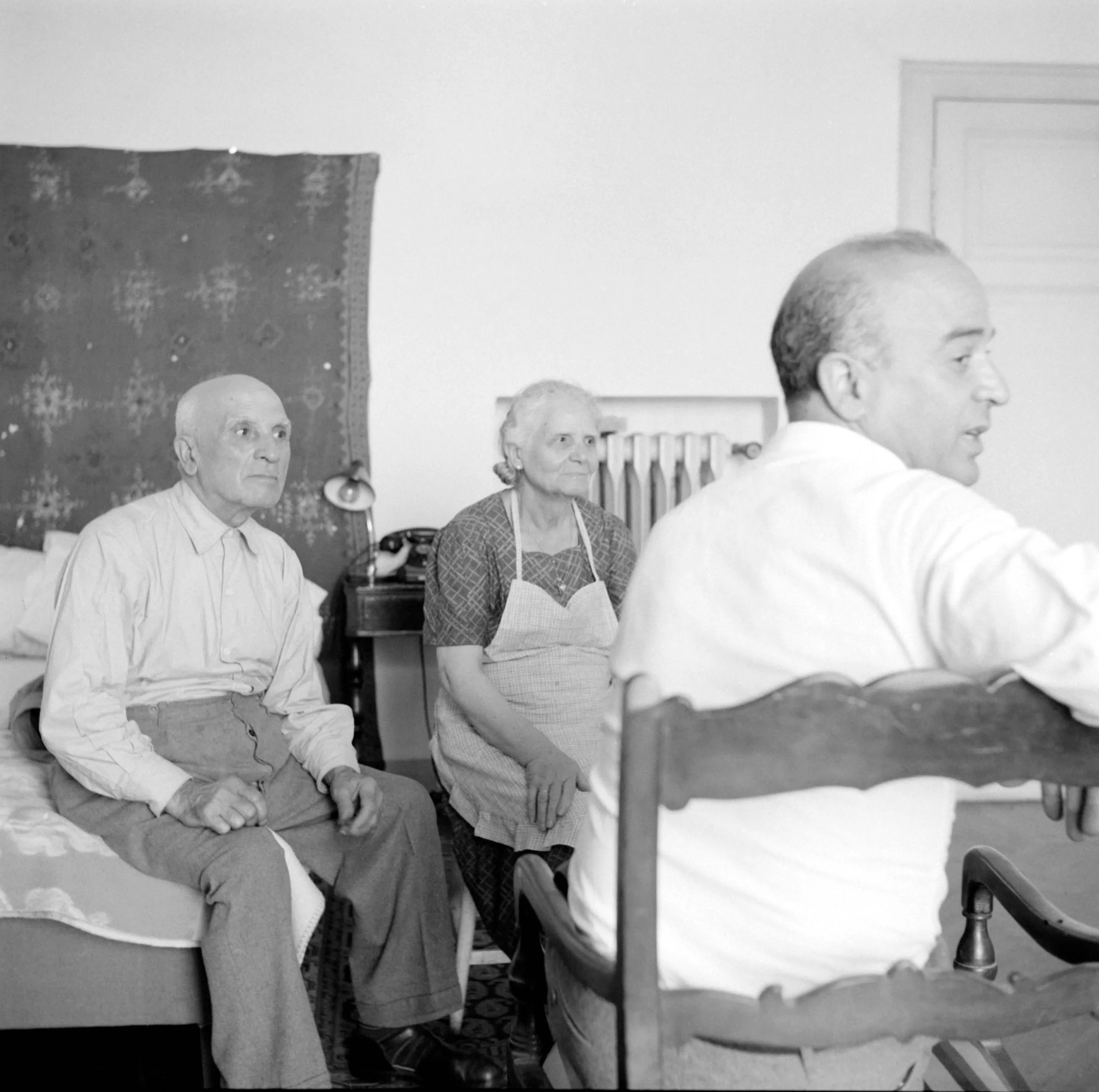 Black and white photograph of two older adults seated on a bed listening to a third person, shown from behind in a simply furnished room with a patterned textile on the wall