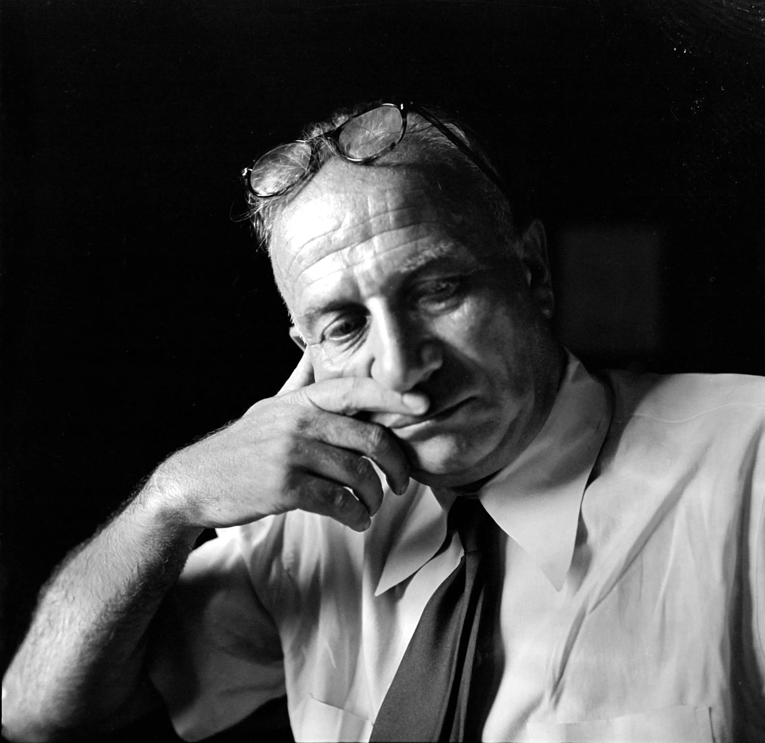 Black and white portrait photograph, man from the chest up, chin resting on raised fist, strong directional lighting, glasses pushed up on forehead