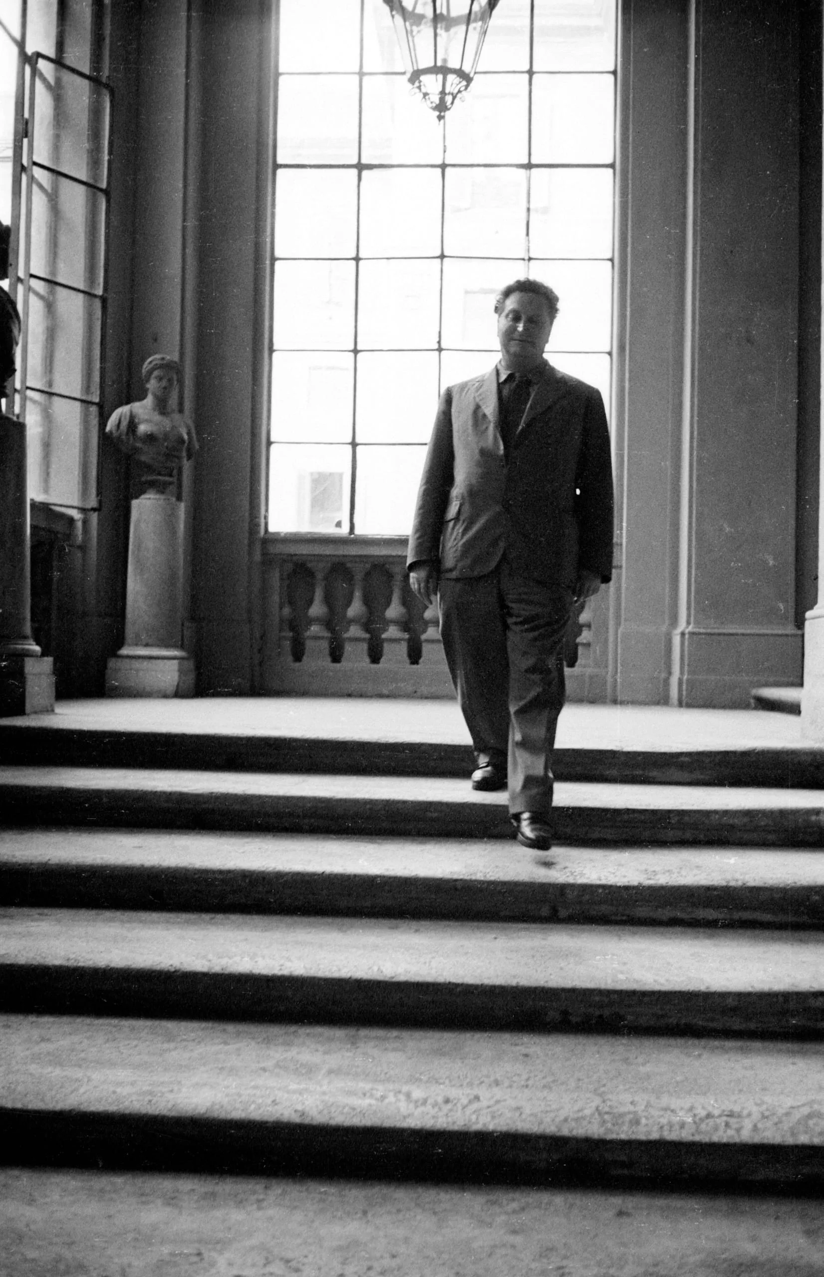 Black and white photograph of a man in a dark suit descending broad stone stairs inside a grand interior, backlit by a large window