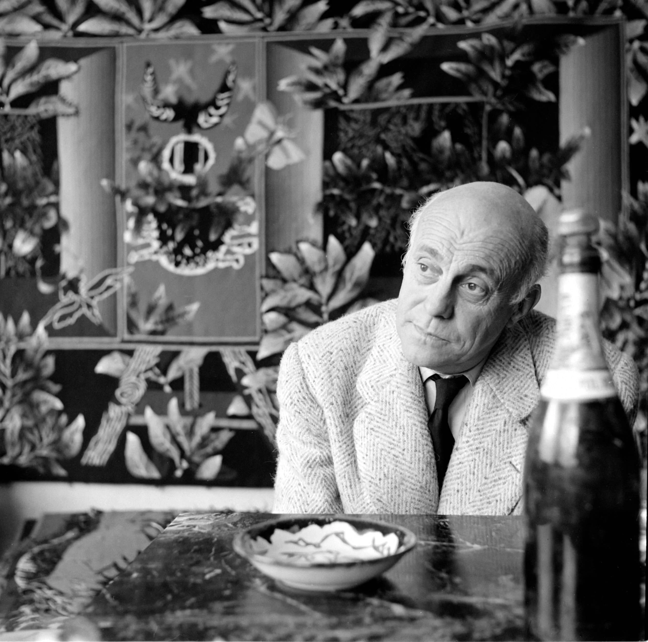 Black and white portrait photograph of a bald, heavyset white man in a tweed blazer, seated at a reflective table with a bottle and bowl, against patterned foliage wallpaper