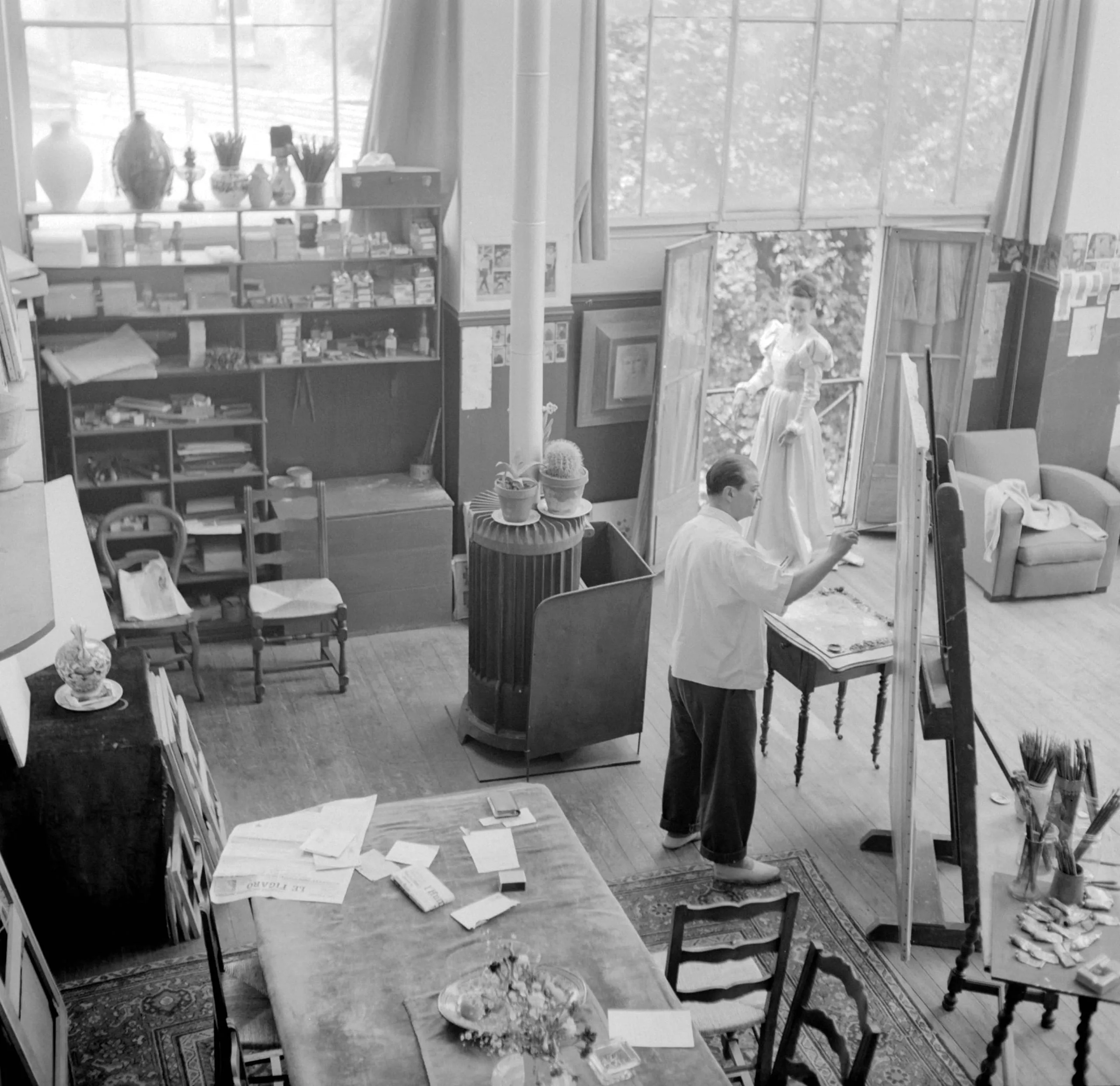 Black and white photograph looking down into an artist's studio, a man painting at an easel while a woman in a long gown poses as his model near a large window
