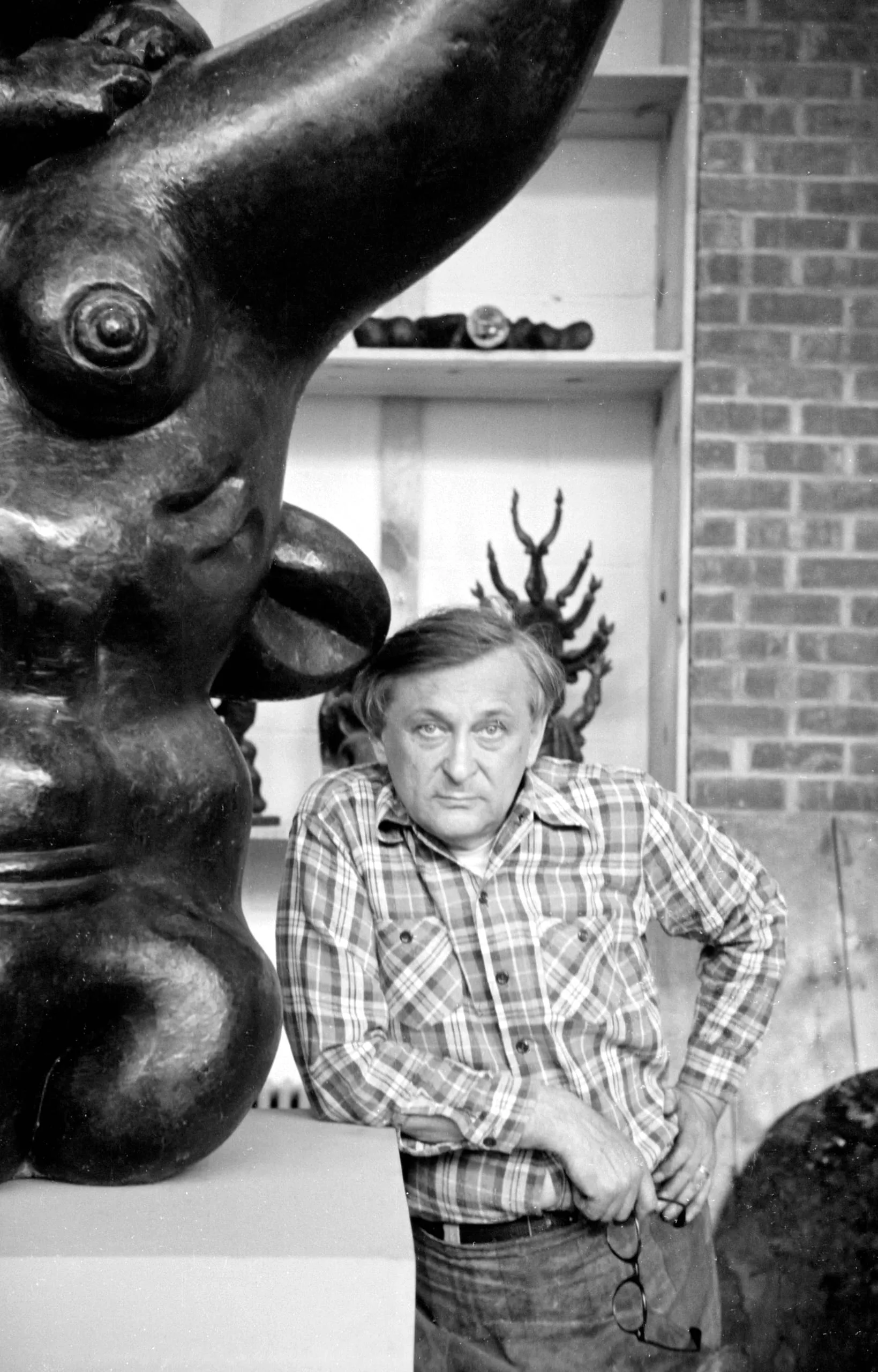 Black and white photograph of a man in a plaid shirt standing beside a large abstract bronze sculpture in a studio, holding eyeglasses at his side