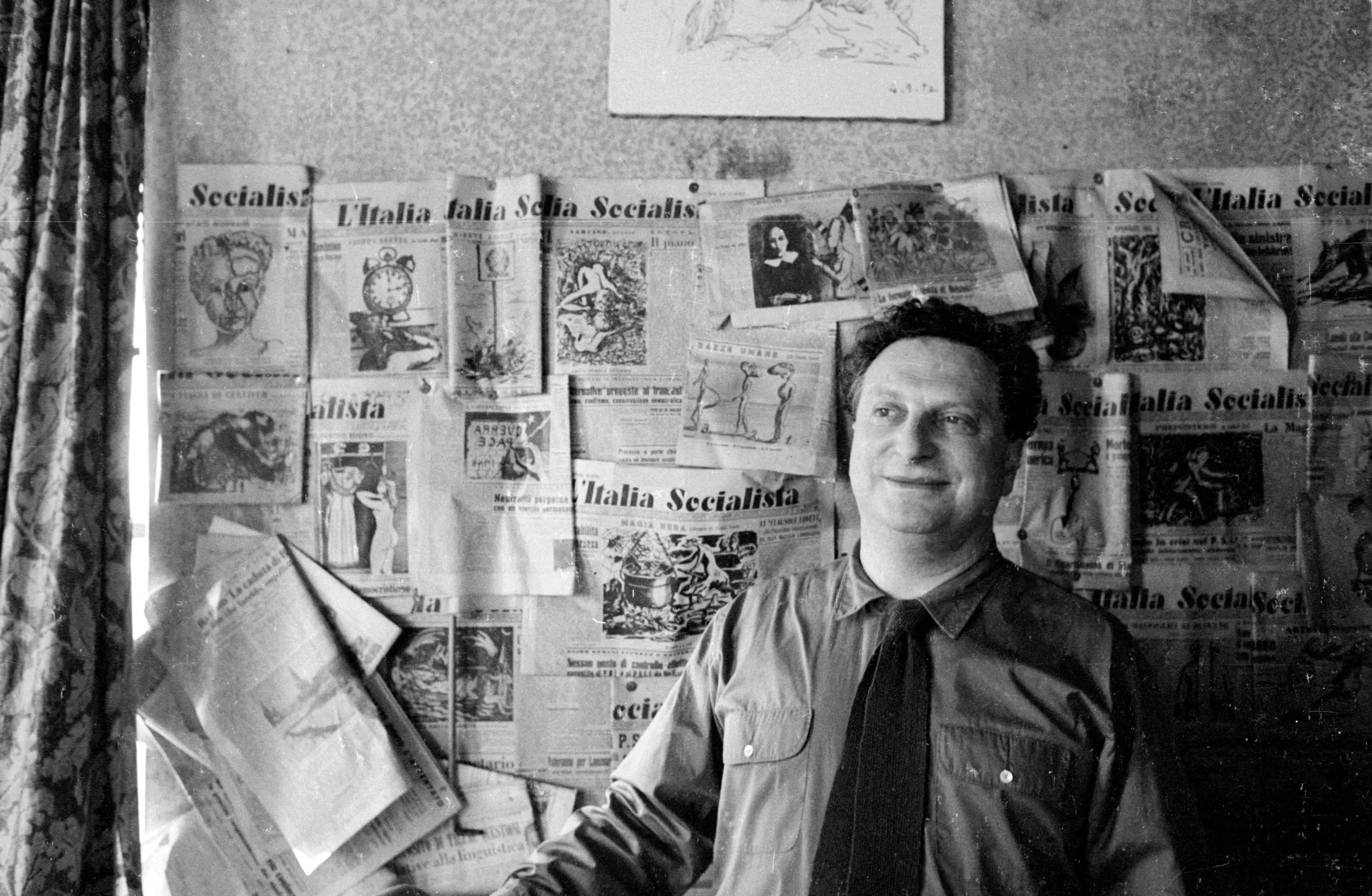 Black and white photograph, a man in a collared shirt and tie stands before a wall covered in Italian newspaper pages reading 'L'Italia Socialista'