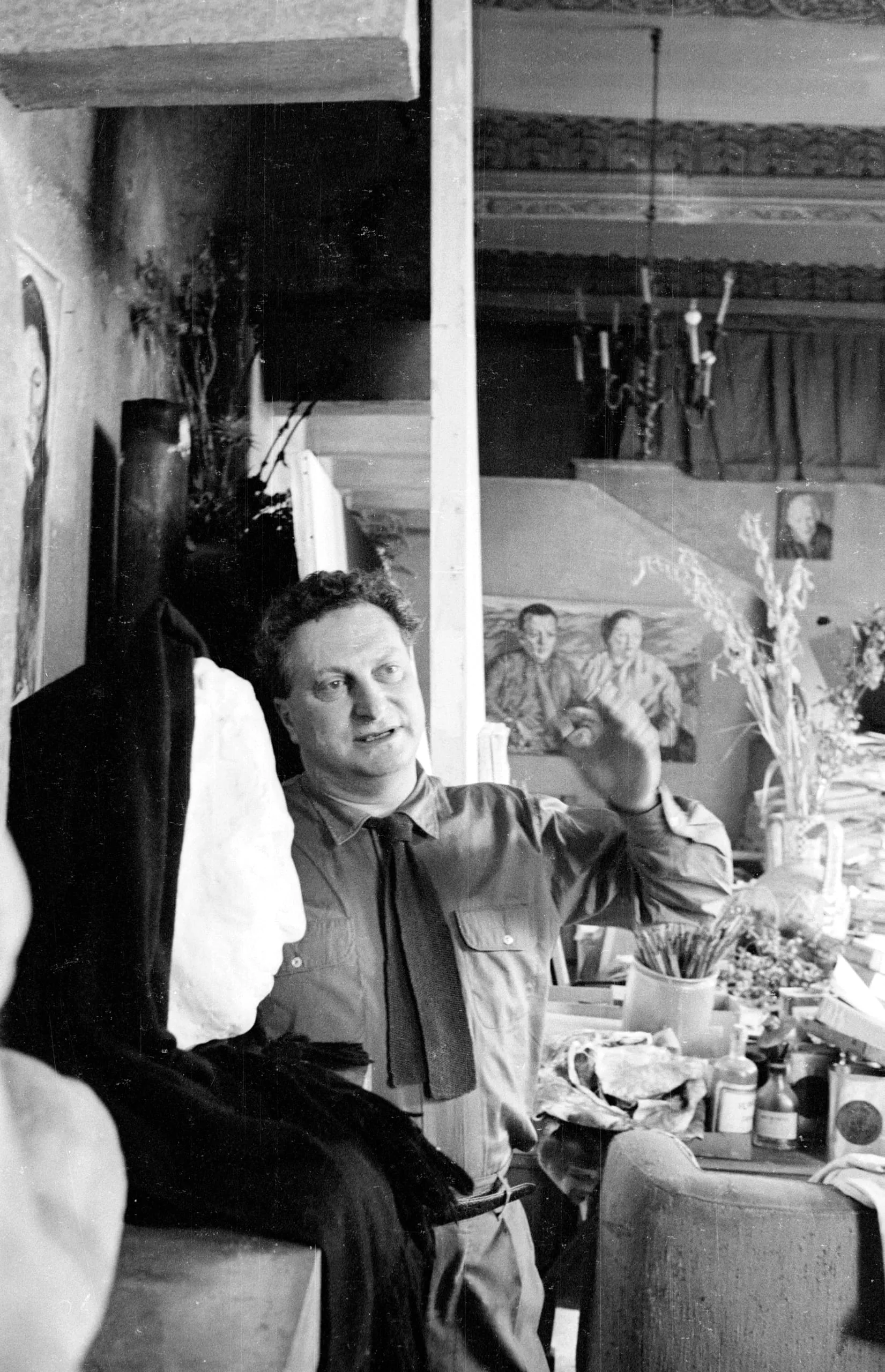 Black and white photograph of a heavyset man with curly hair seated in a cluttered artist's studio, one hand raised, surrounded by canvases, sculptures, and art supplies